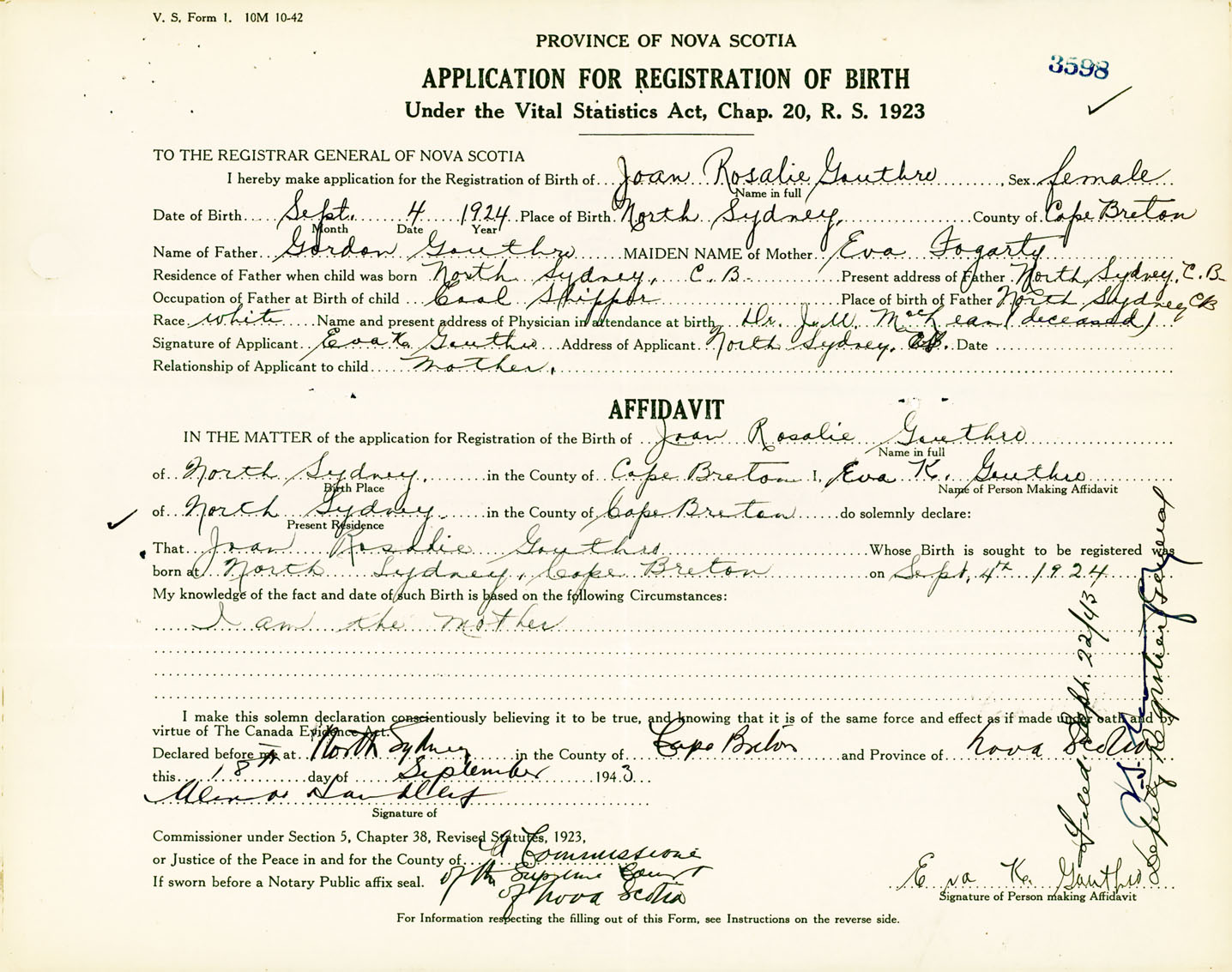 Female Birth Registration: Year: 1924 number: 91700598