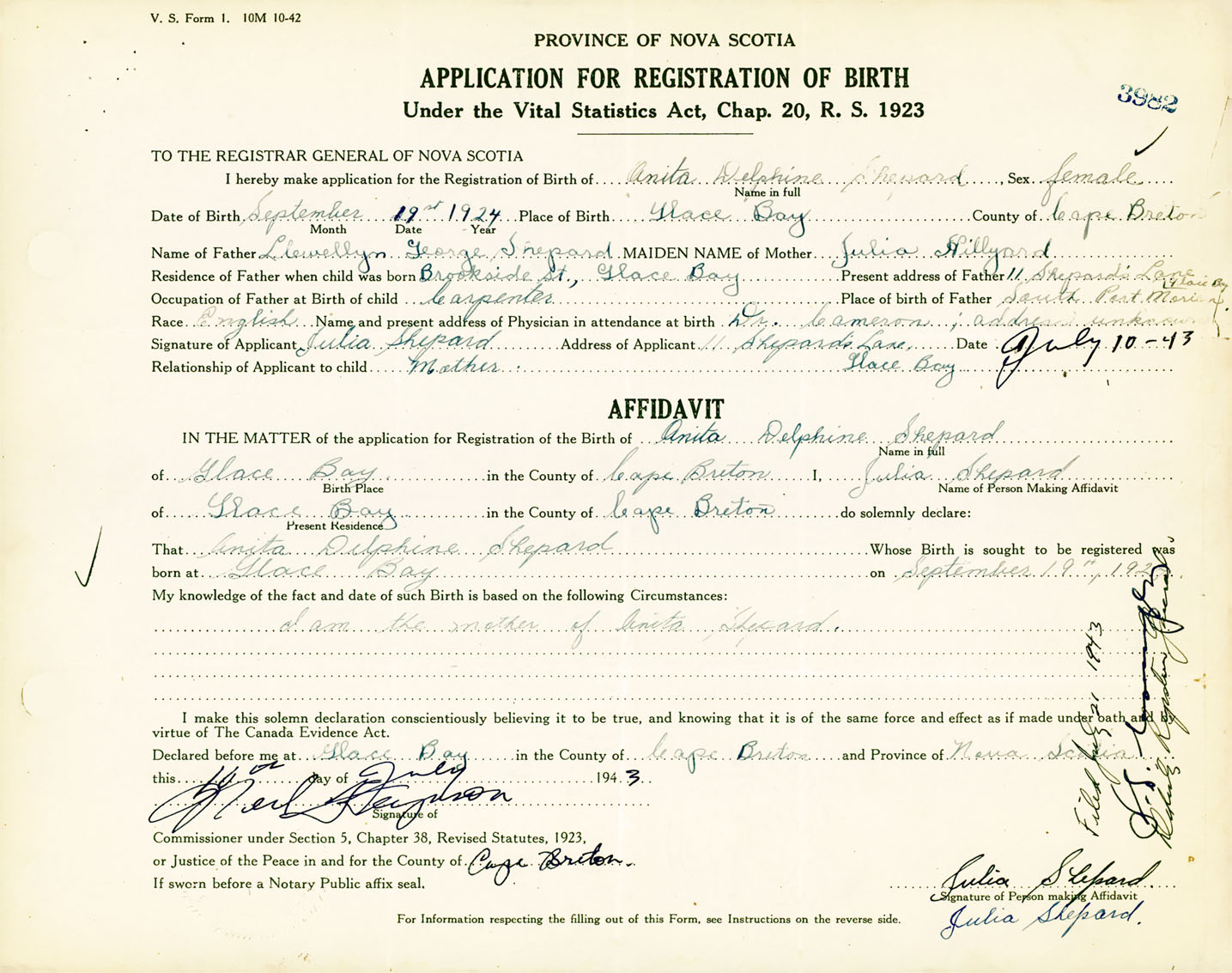 Female Birth Registration: Year: 1924 number: 91700982