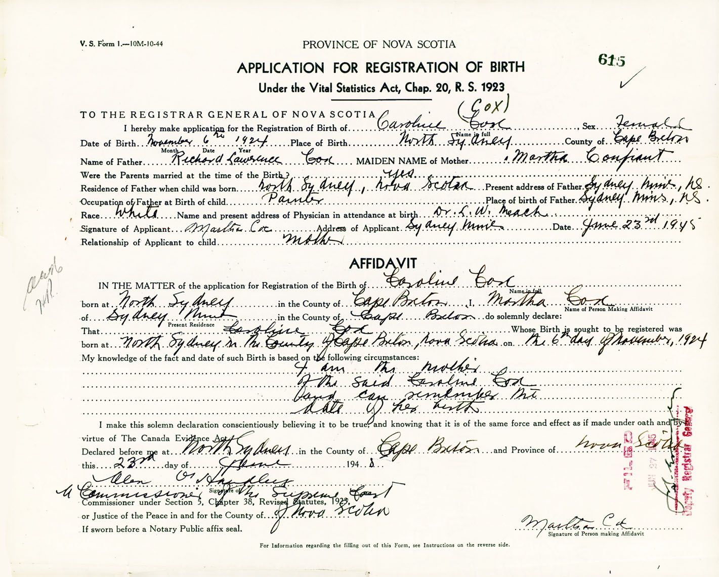 Female Birth Registration: Year: 1924 number: 91900615