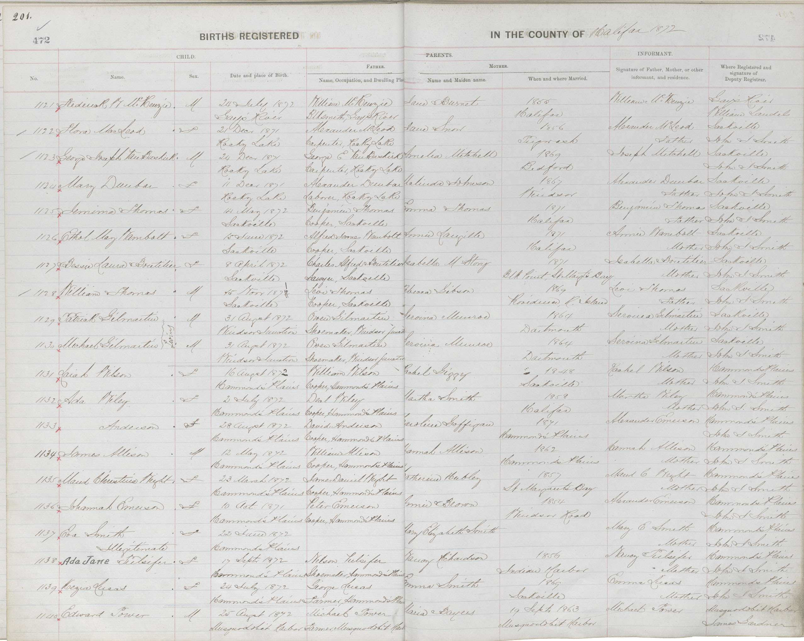 Birth Registration: Year: 1872 book: 1810 page: 201 number: 1140