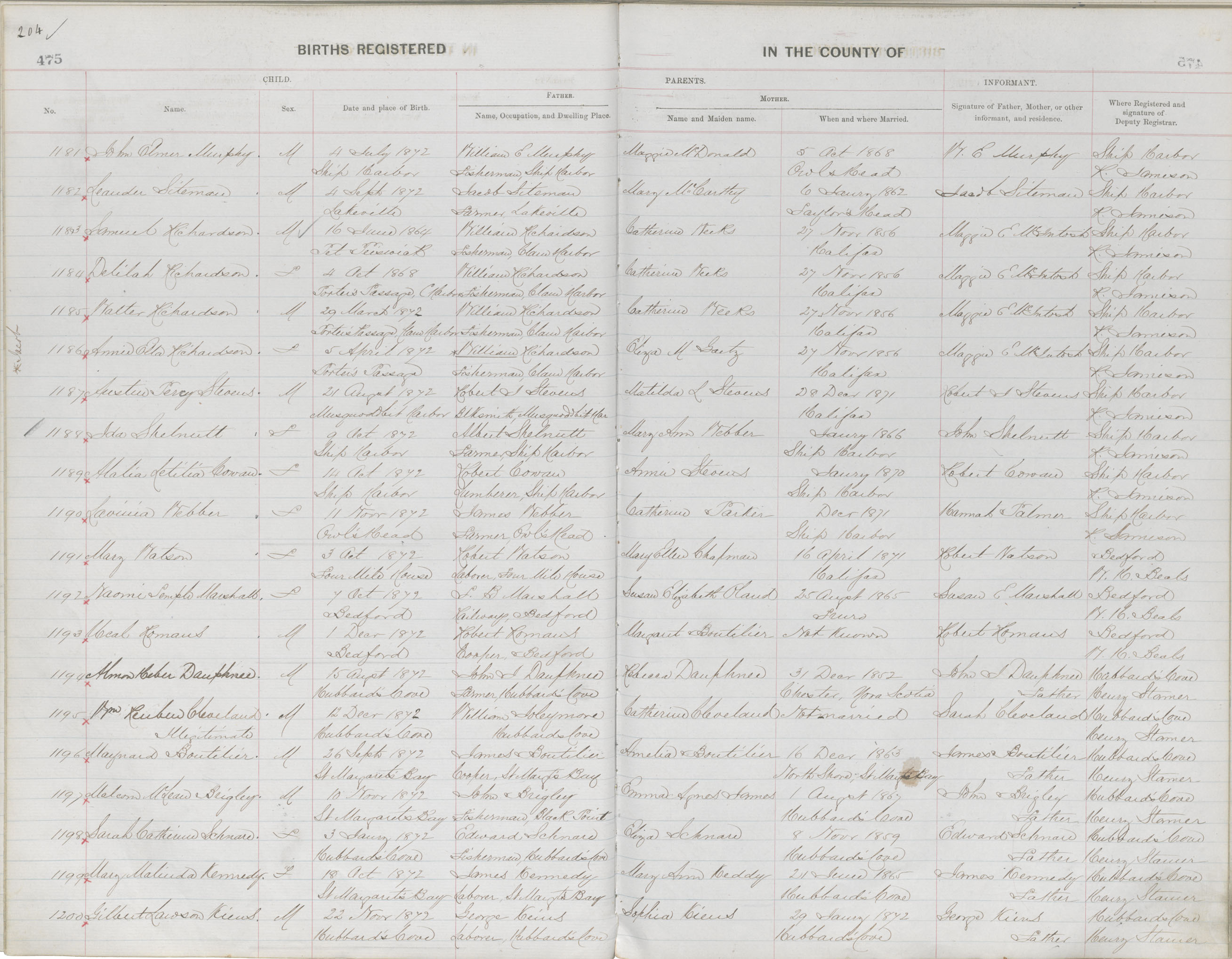 Birth Registration: Year: 1872 book: 1810 page: 204 number: 1200