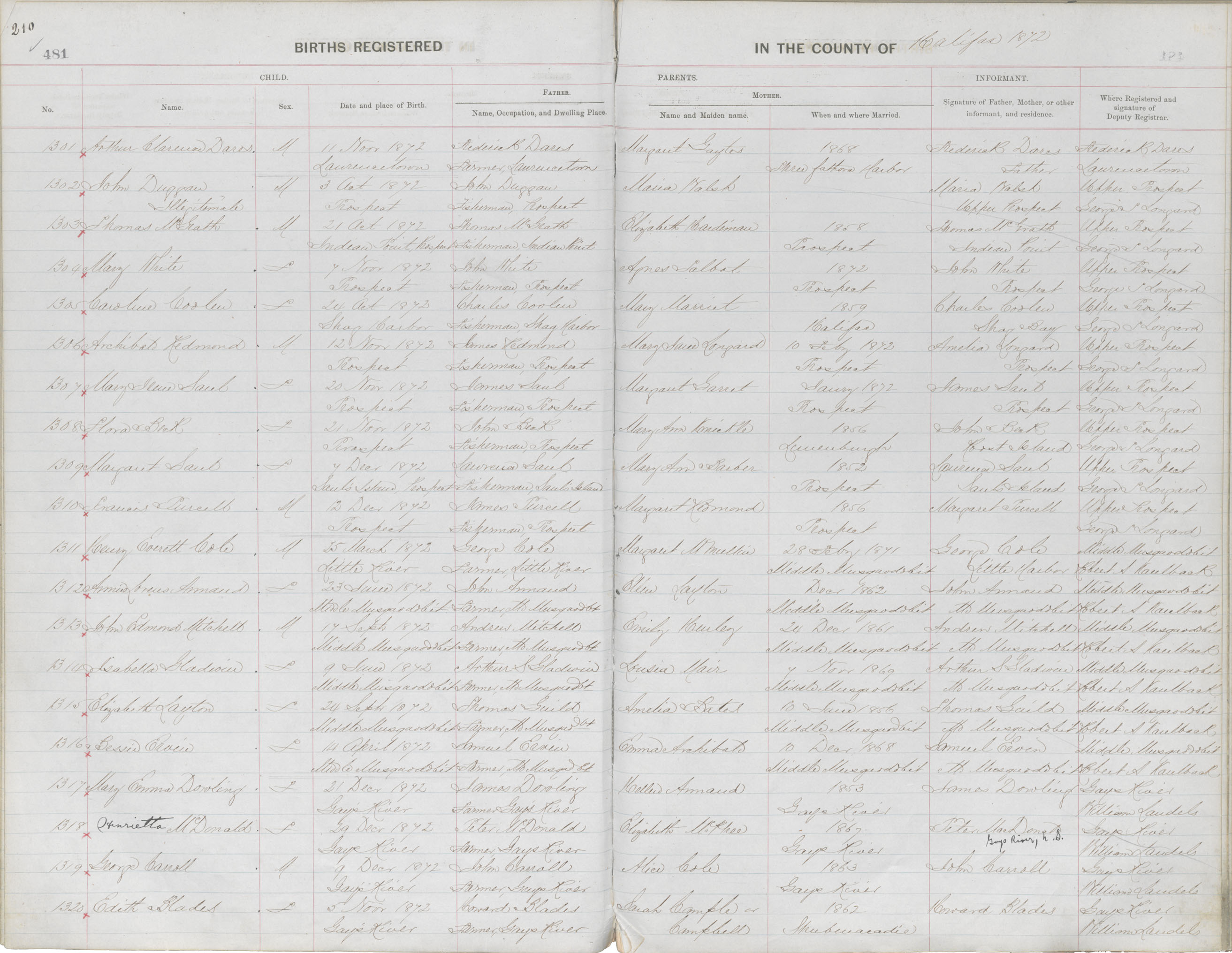 Birth Registration: Year: 1872 book: 1810 page: 210 number: 1320