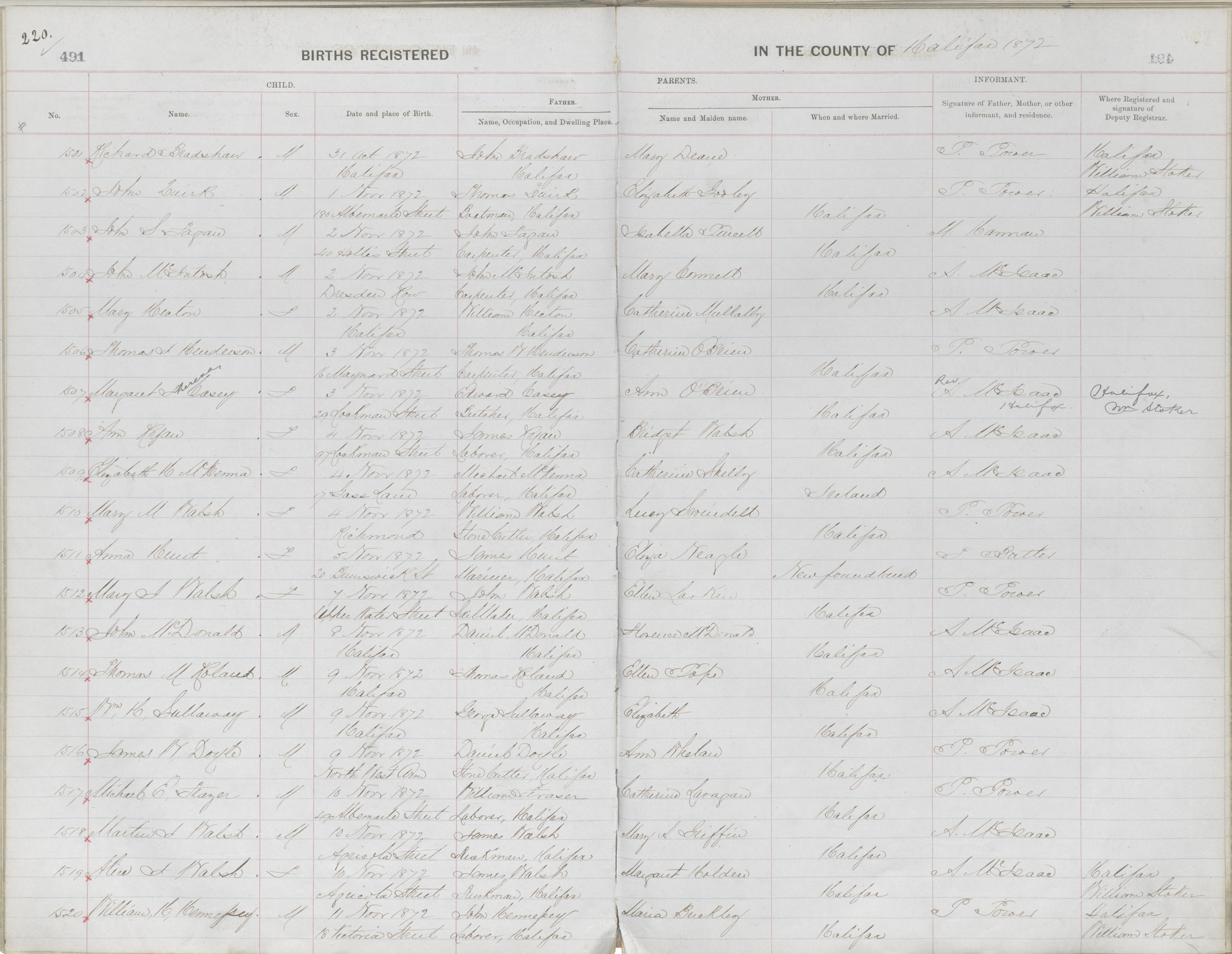 Birth Registration: Year: 1872 book: 1810 page: 220 number: 1501