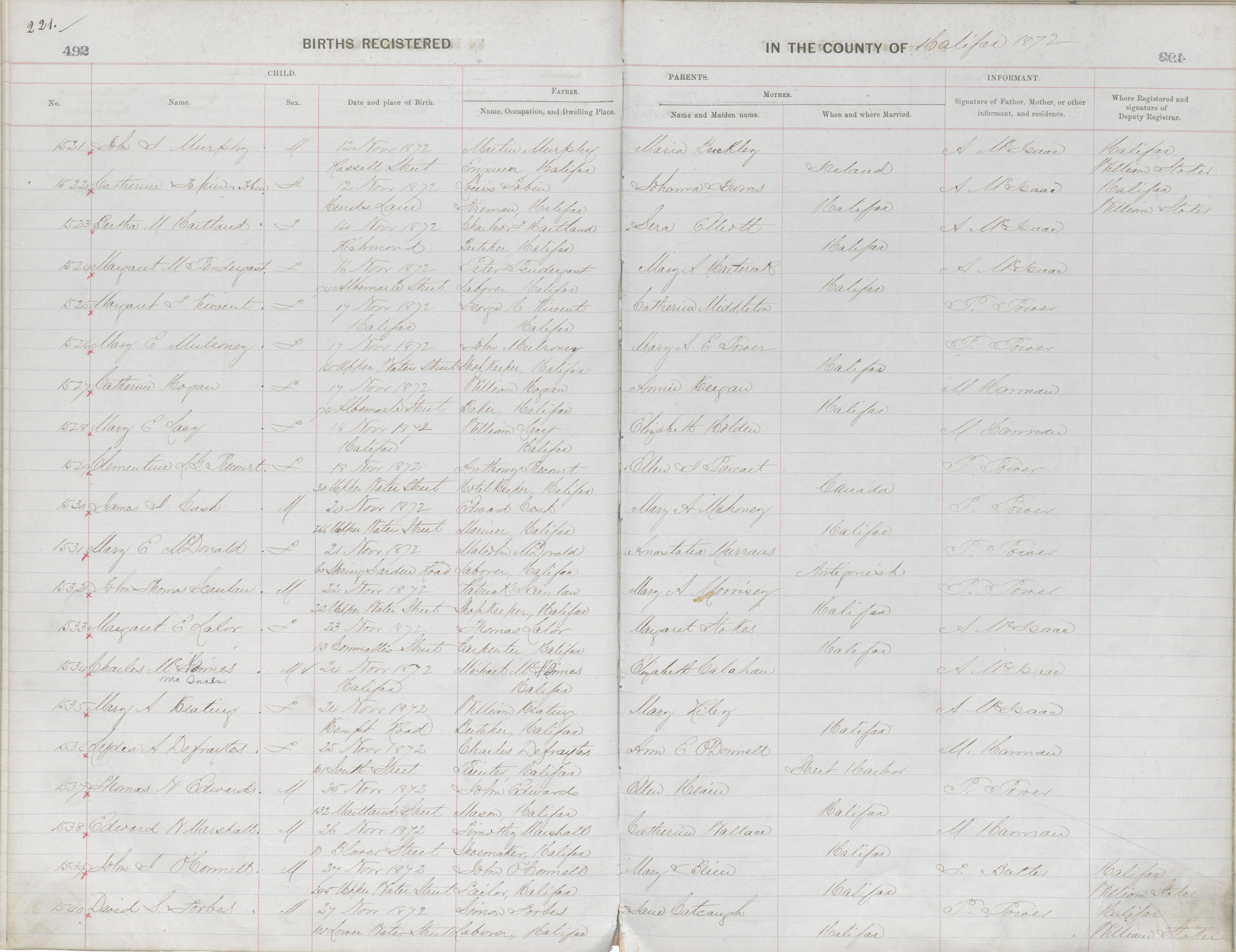 Birth Registration: Year: 1872 book: 1810 page: 221 number: 1521