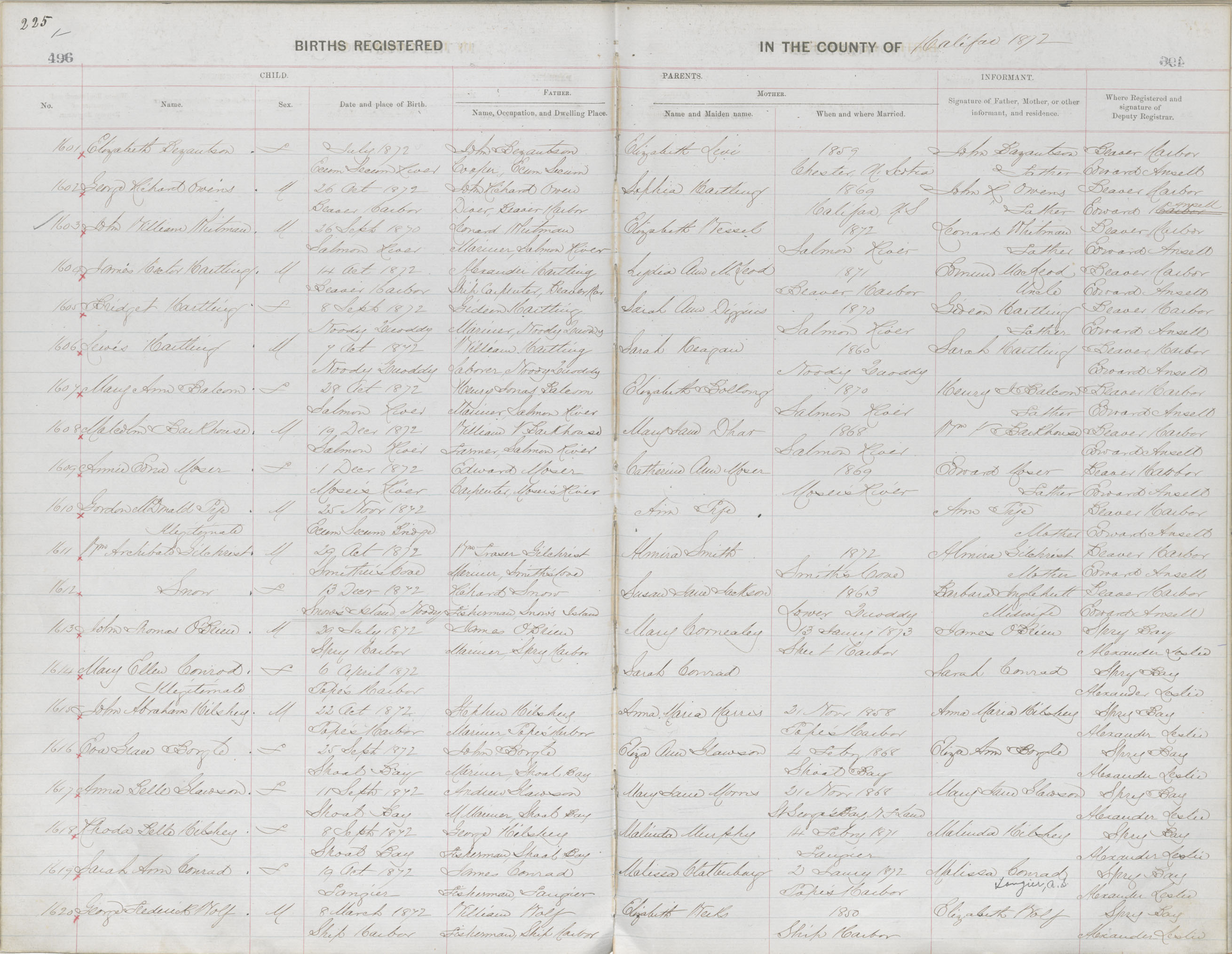 Birth Registration: Year: 1872 book: 1810 page: 225 number: 1601