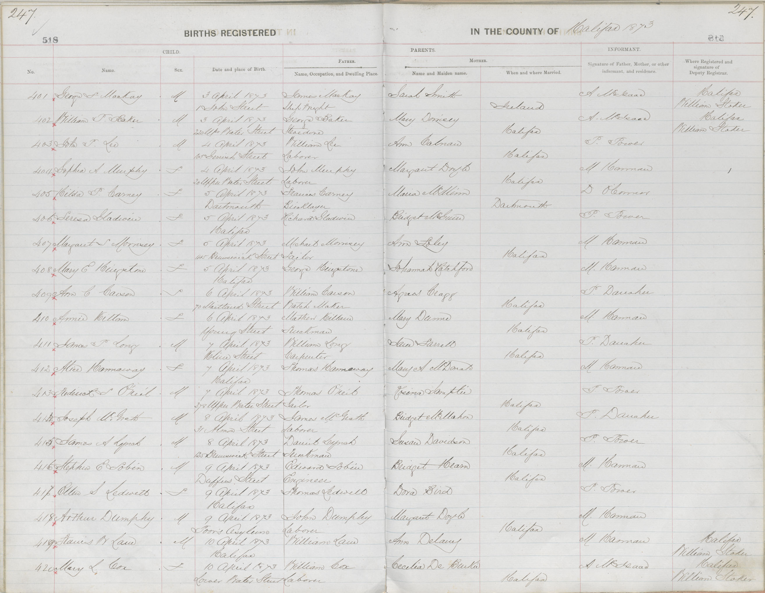Birth Registration: Year: 1873 book: 1810 page: 247 number: 401