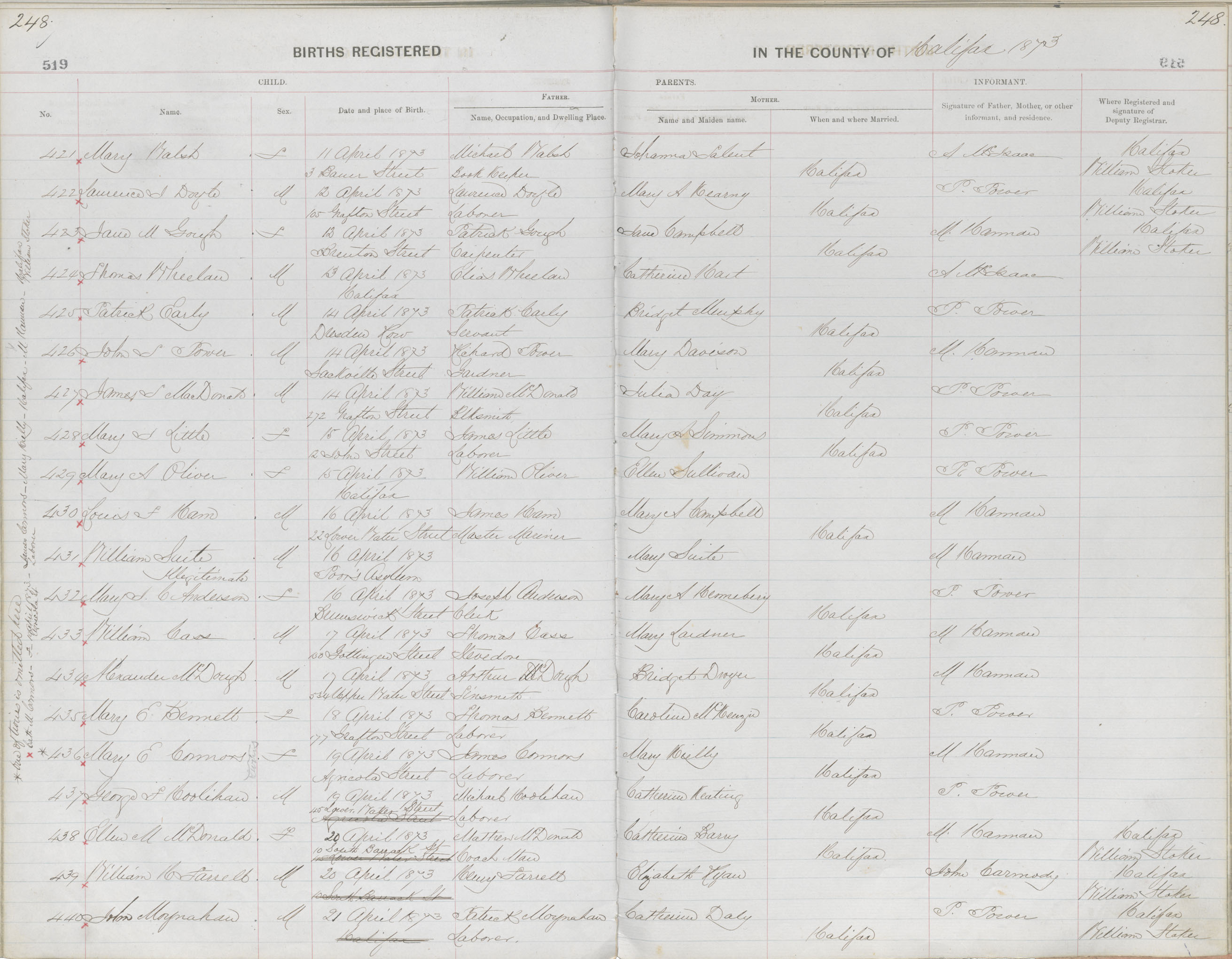 Birth Registration: Year: 1873 book: 1810 page: 248 number: 421