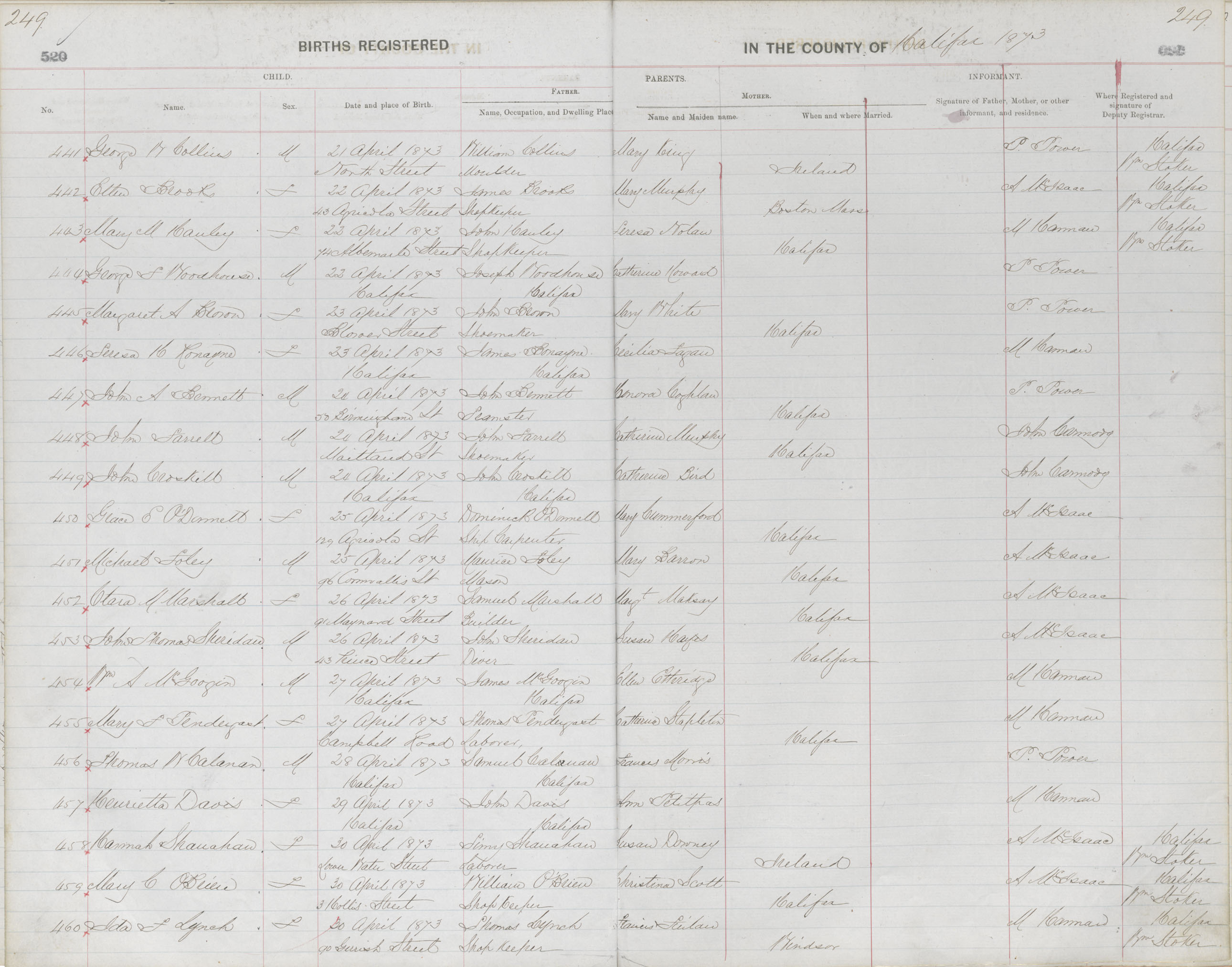 Birth Registration: Year: 1873 book: 1810 page: 249 number: 441