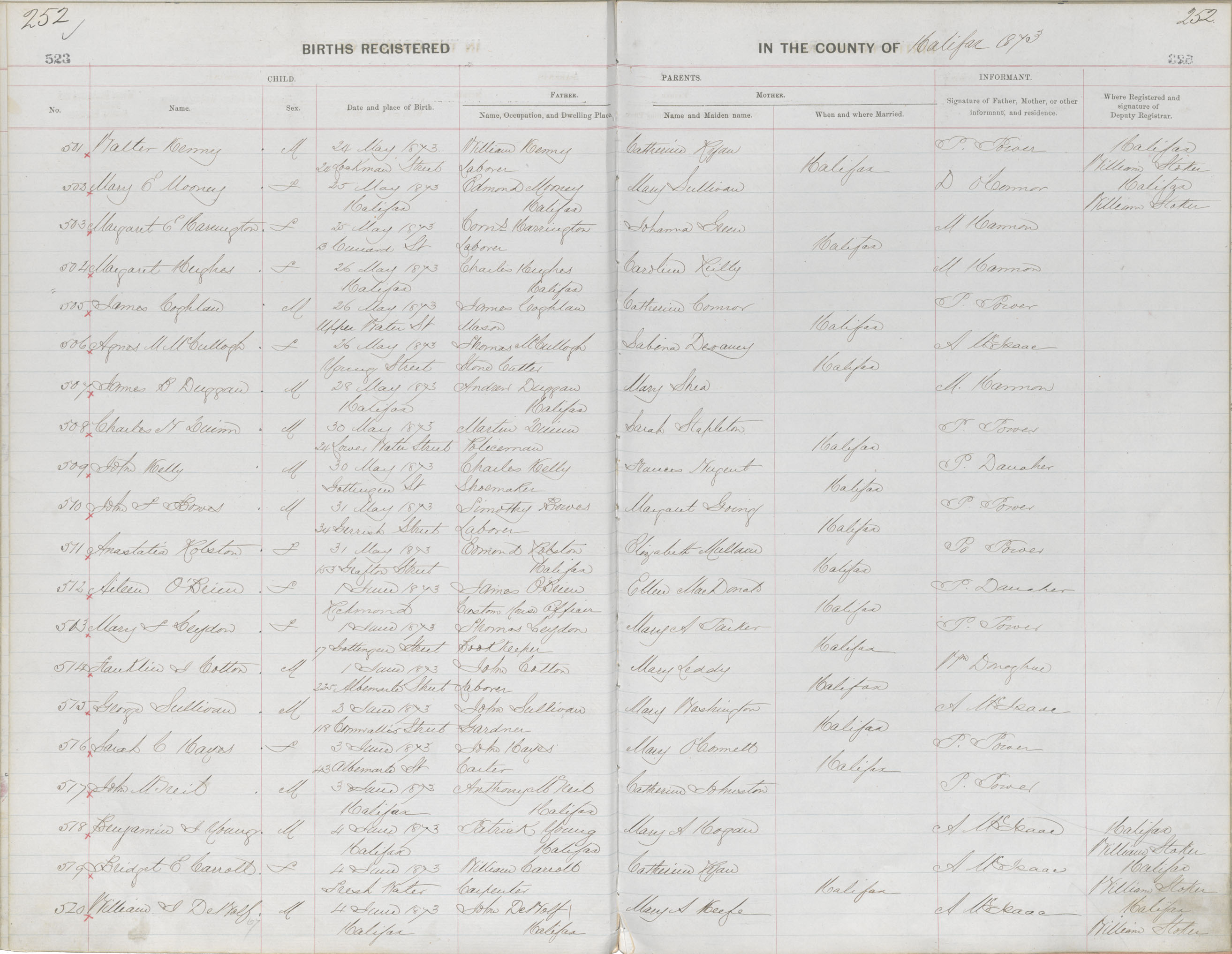 Birth Registration: Year: 1873 book: 1810 page: 252 number: 520