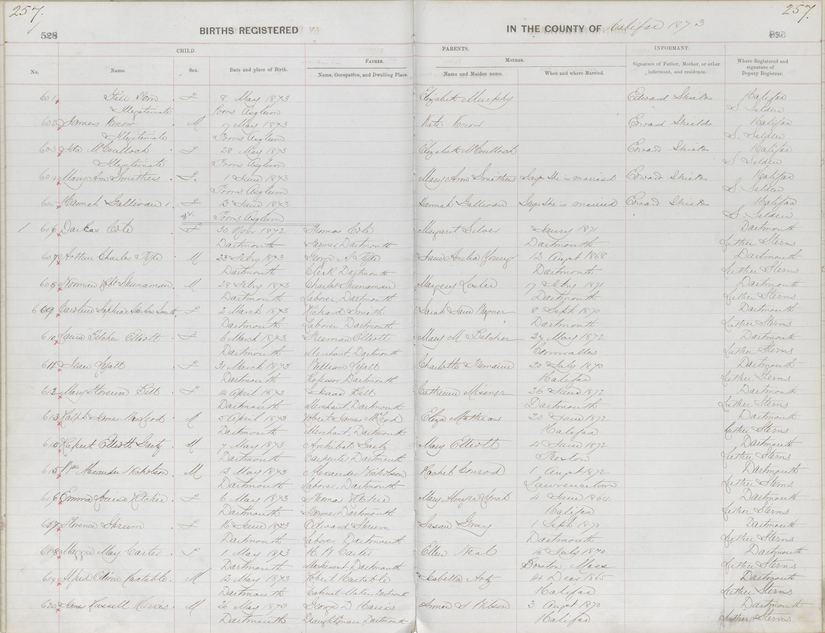 Birth Registration: Year: 1873 book: 1810 page: 257 number: 620
