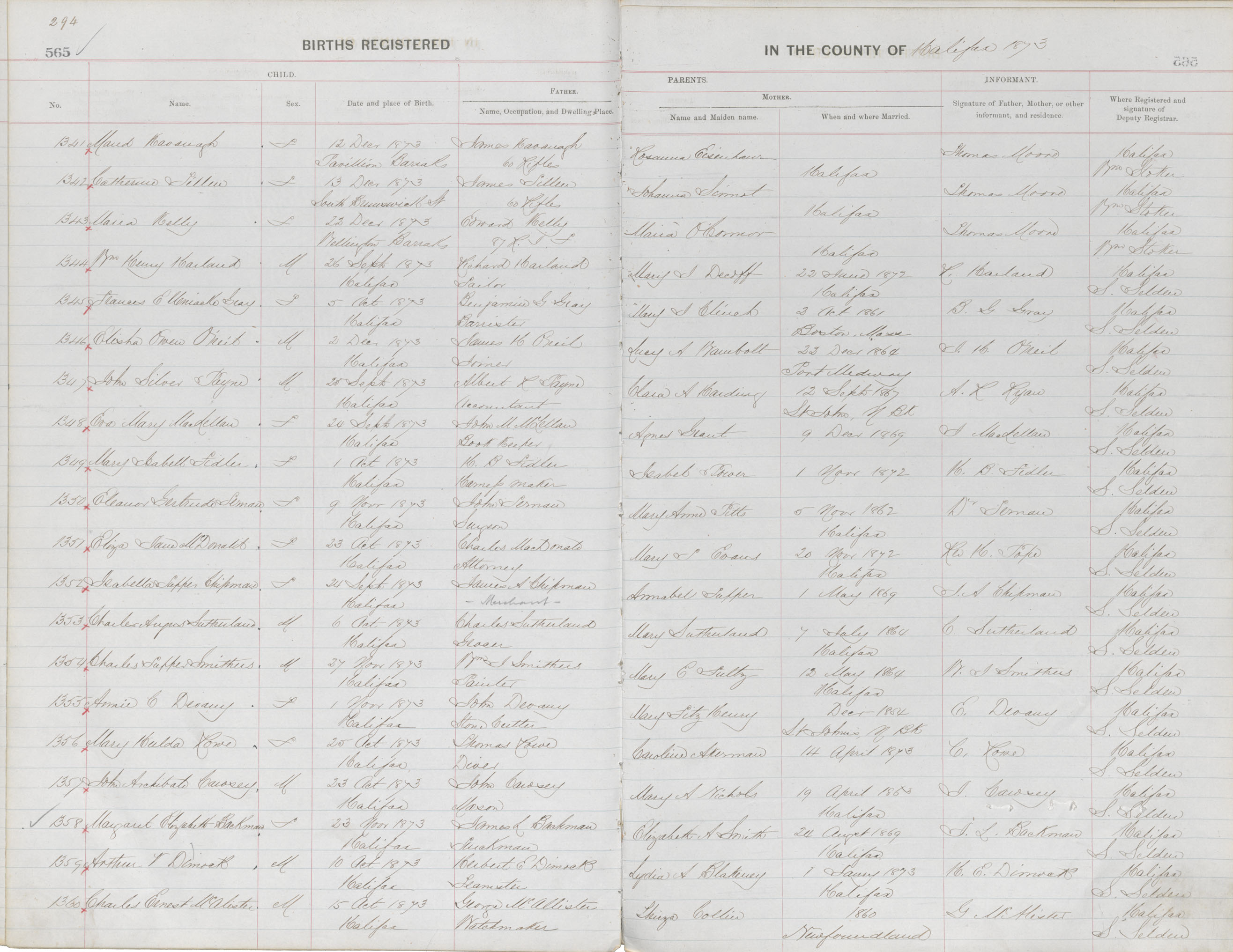 Birth Registration: Year: 1873 book: 1810 page: 294 number: 1341