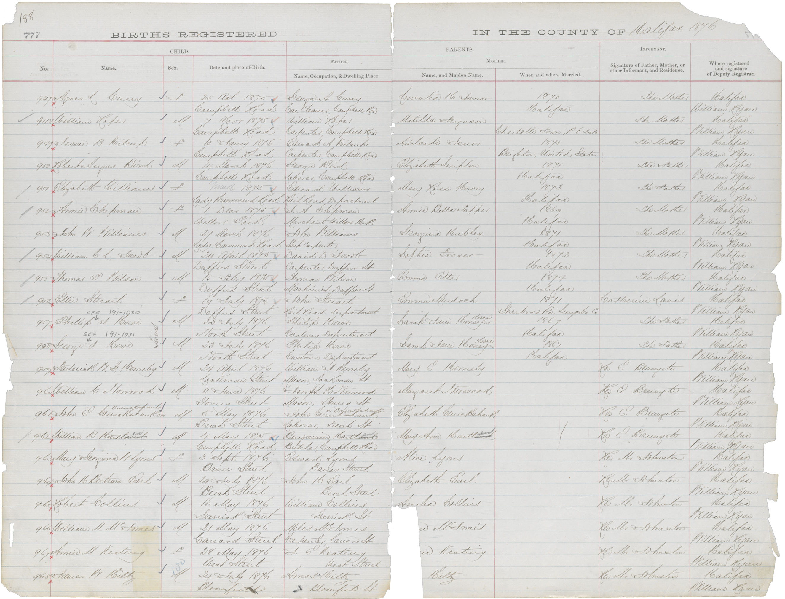 Birth Registration: Year: 1876 book: 1811 page: 188 number: 968