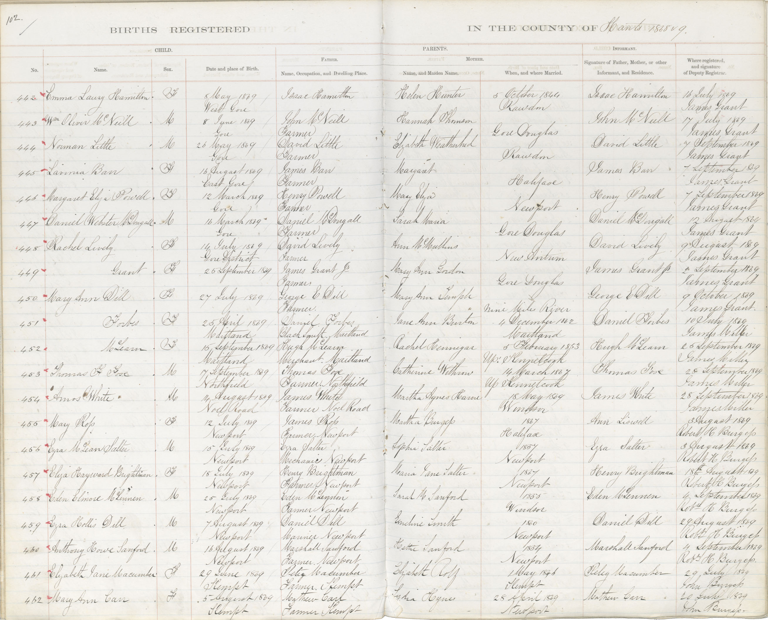 Birth Registration: Year: 1869 book: 1812 page: 102 number: 462