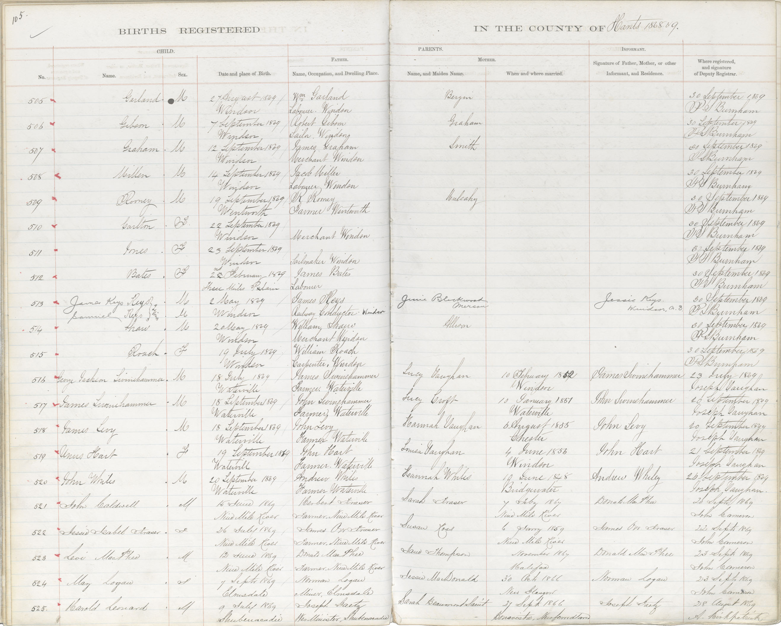 Birth Registration: Year: 1869 book: 1812 page: 105 number: 525