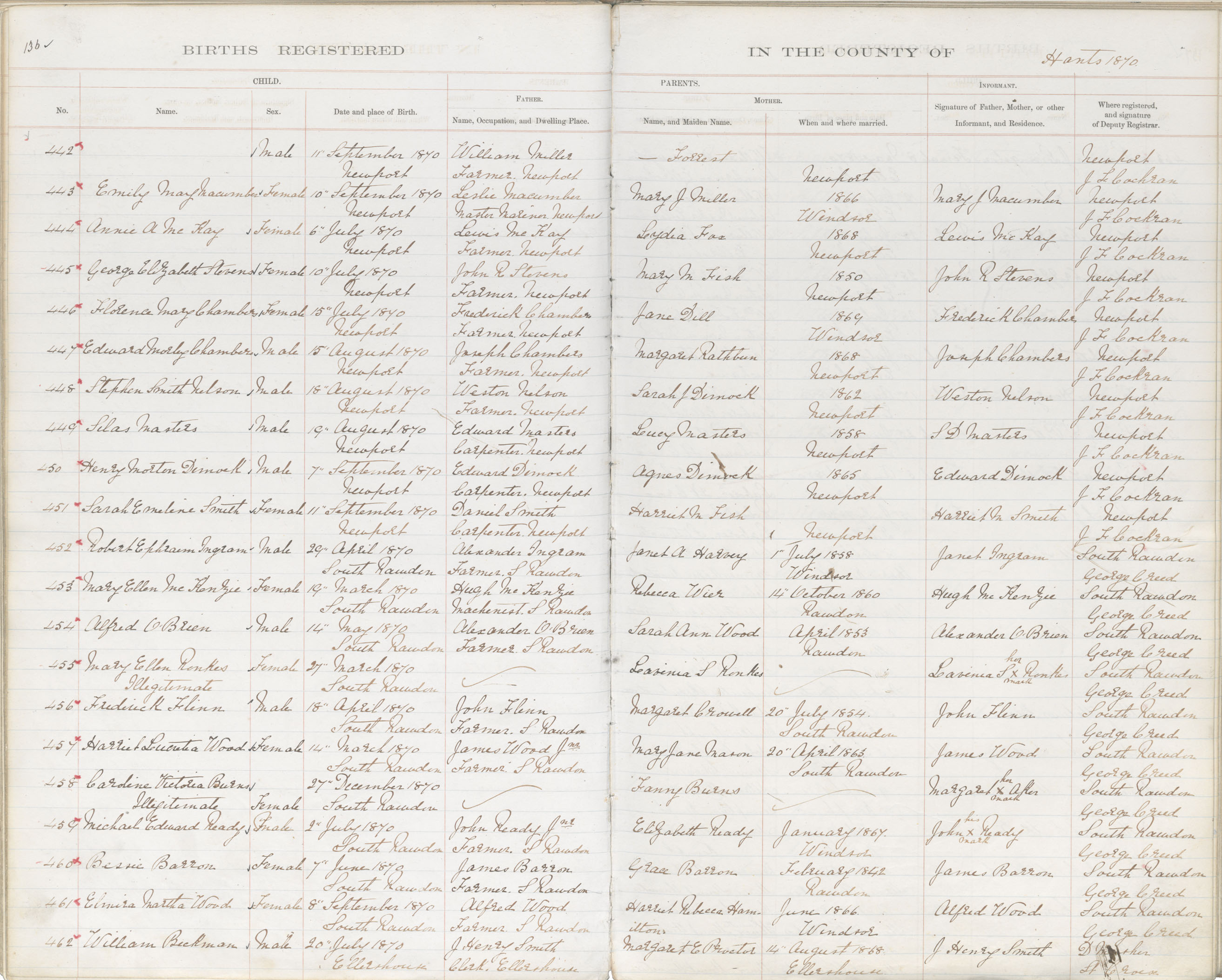 Male Birth Registration: Year: 1870 book: 1812 page: 136 number: 442
