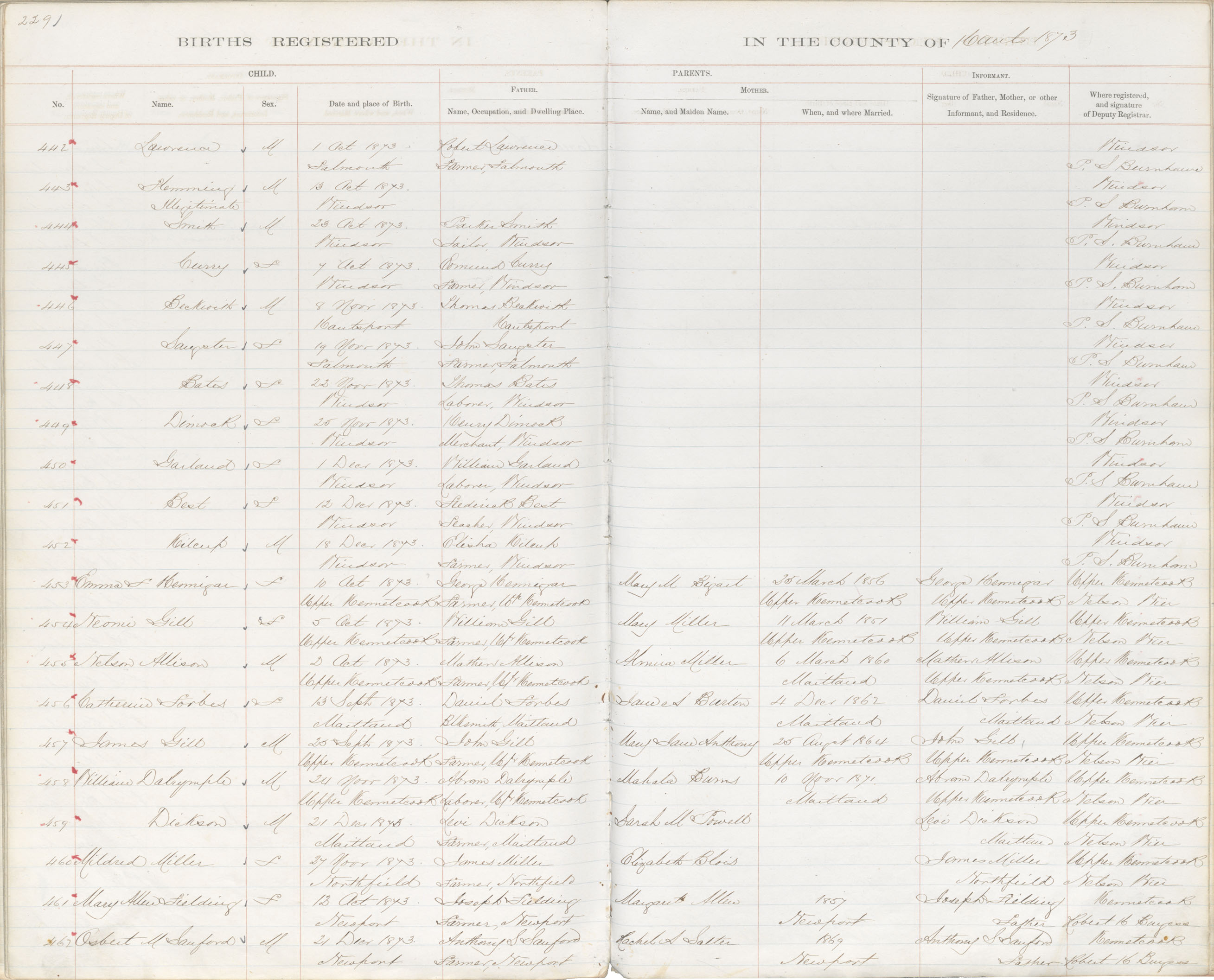 Male Birth Registration: Year: 1873 book: 1812 page: 229 number: 442