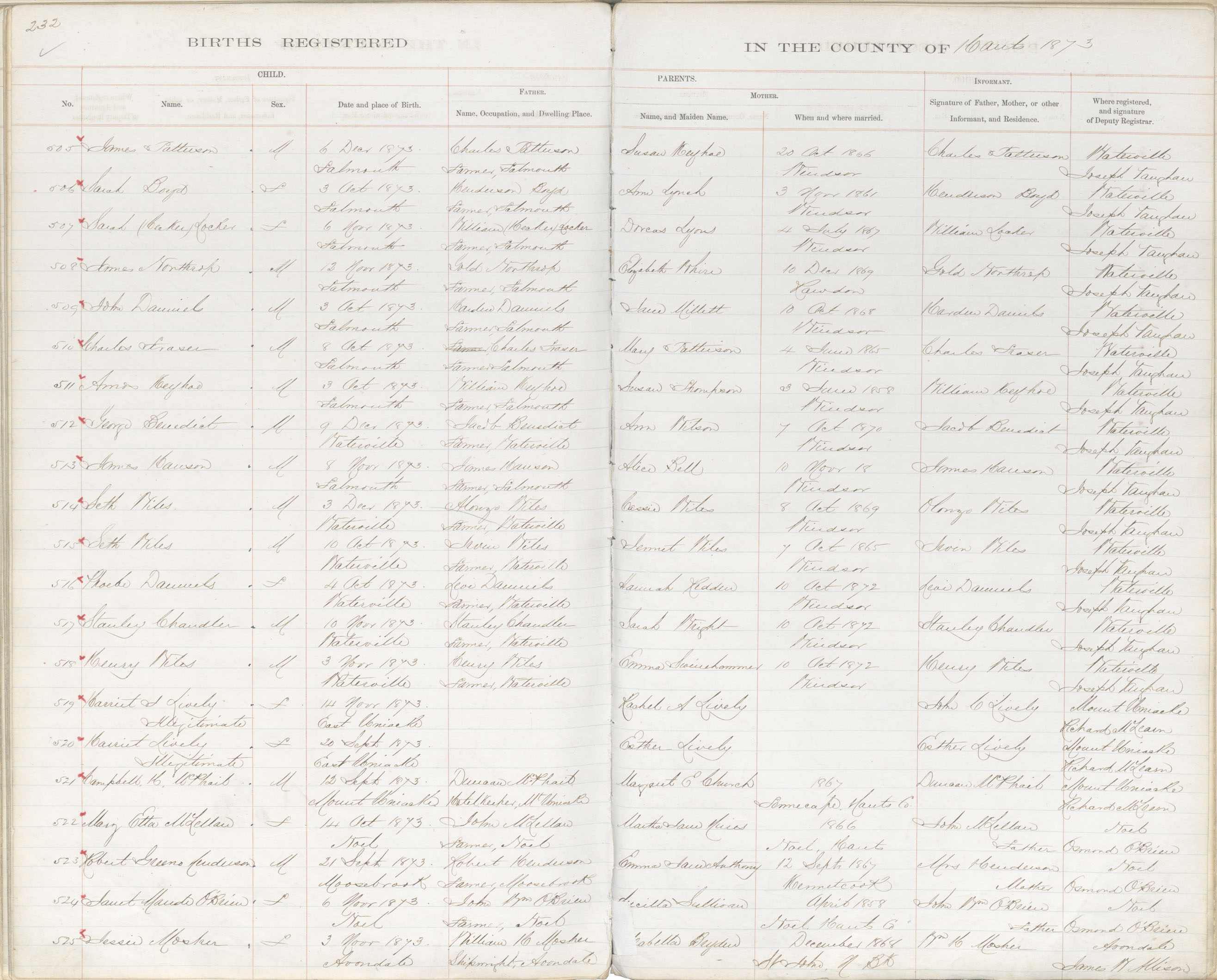 Birth Registration: Year: 1873 book: 1812 page: 232 number: 505