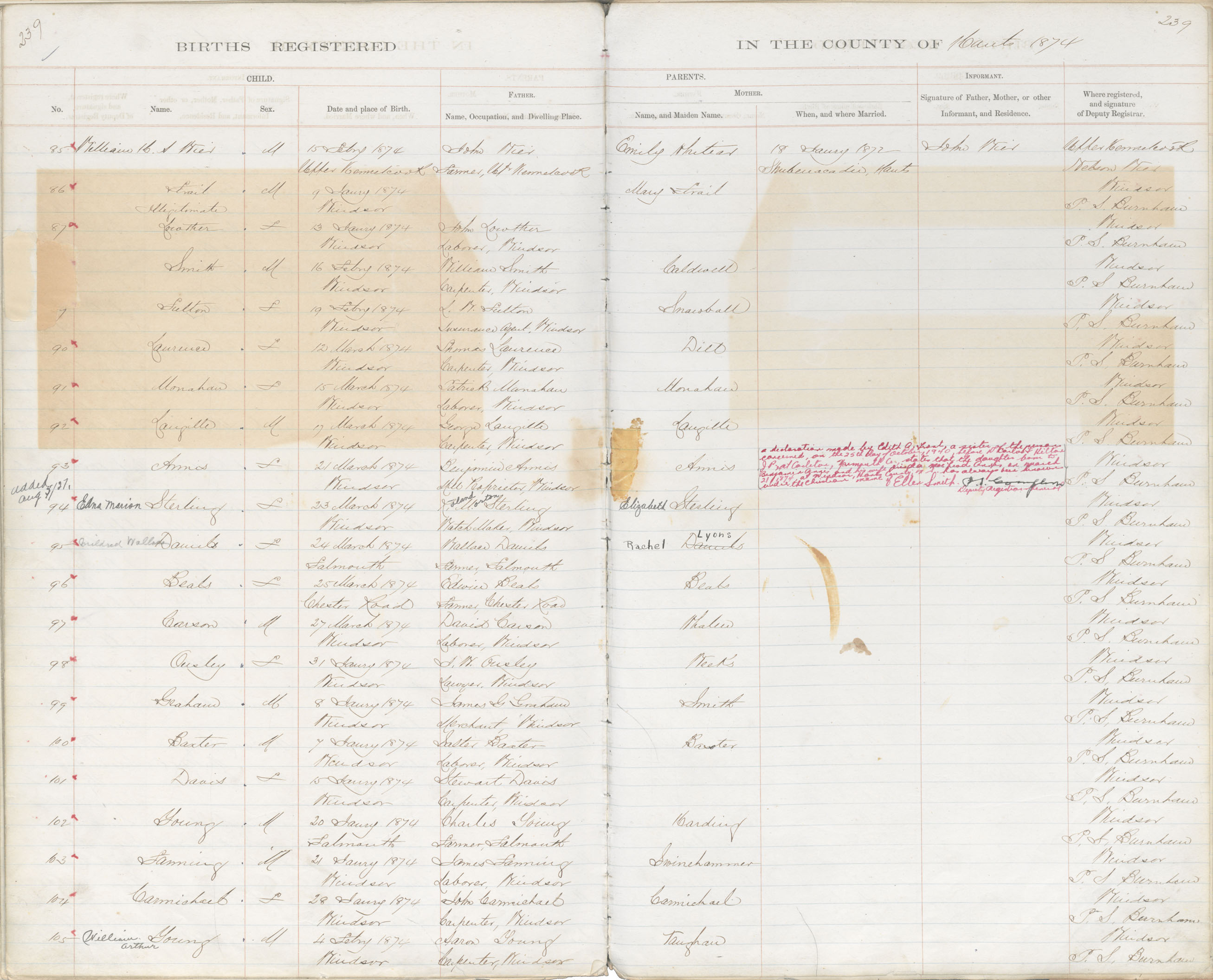 Male Birth Registration: Year: 1874 book: 1812 page: 239 number: 88