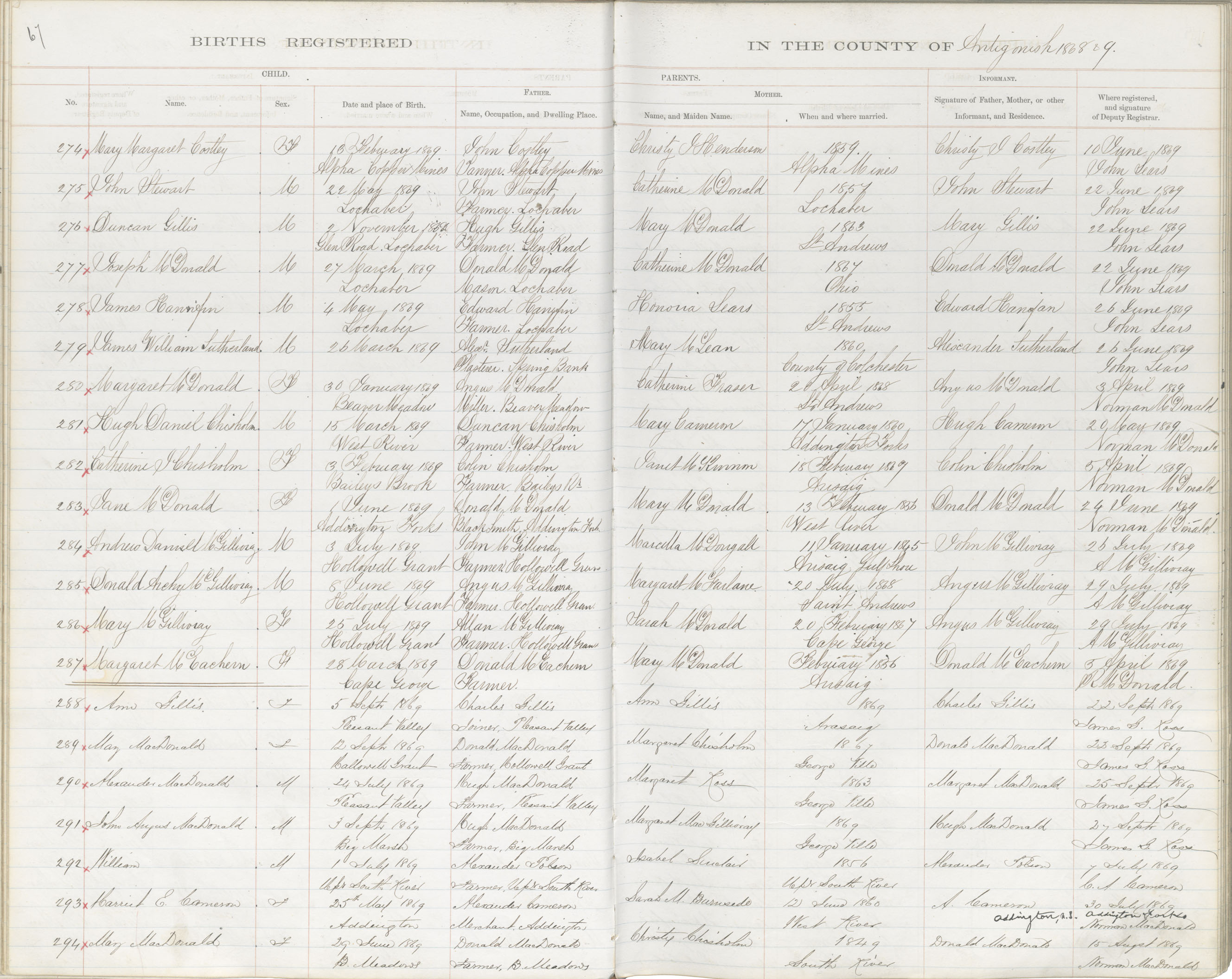 Birth Registration: Year: 1869 book: 1802 page: 67 number: 294