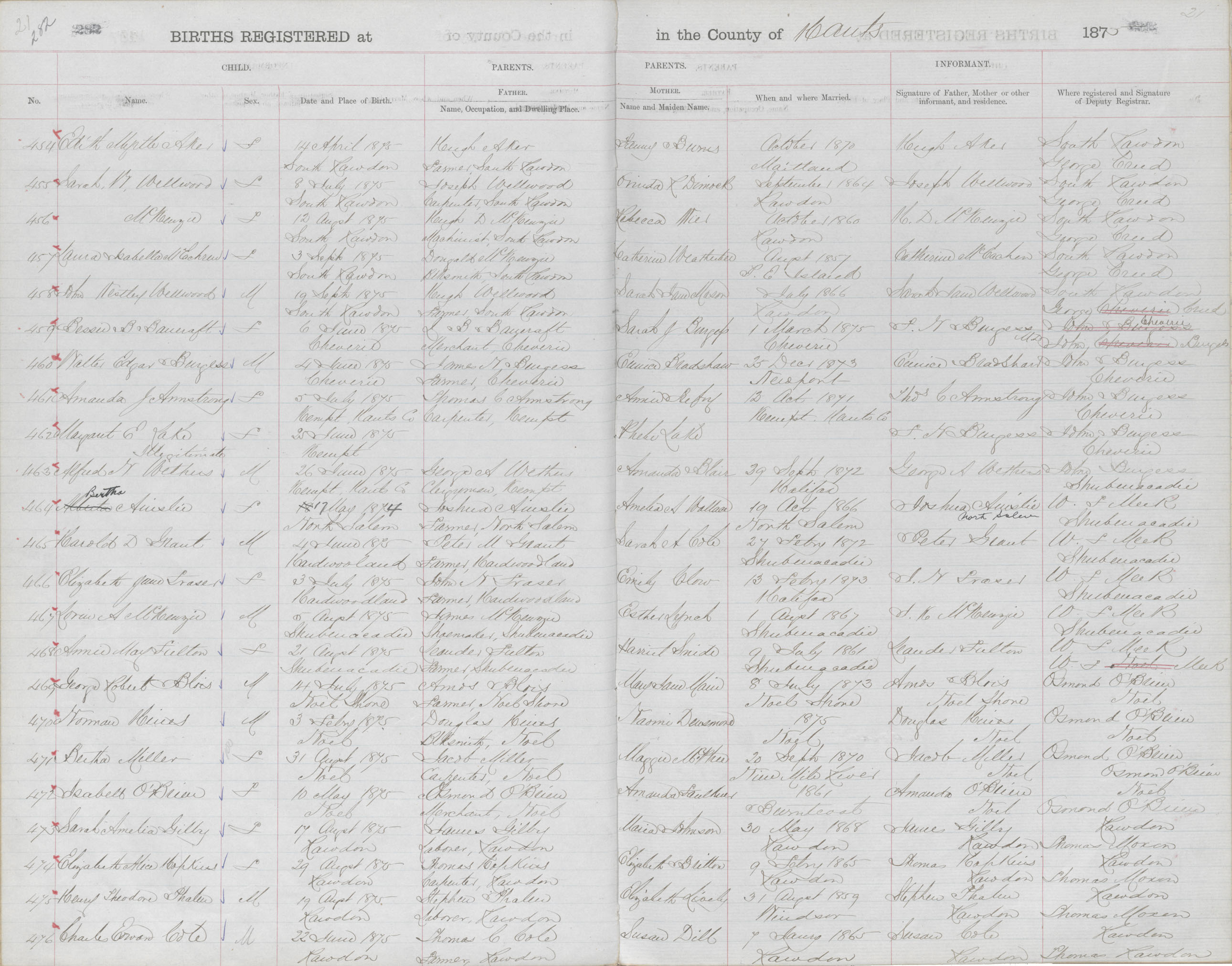 Birth Registration: Year: 1875 book: 1813 page: 21 number: 454