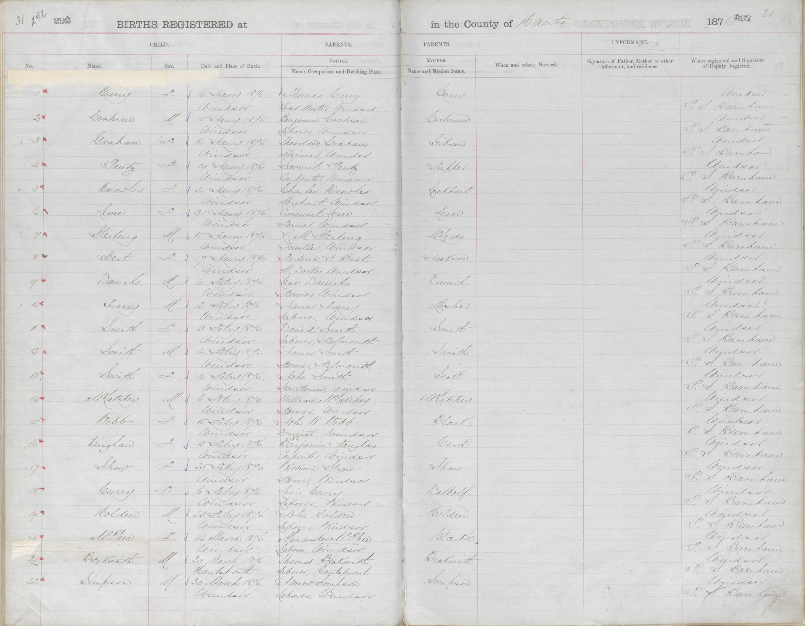 Male Birth Registration: Year: 1876 book: 1813 page: 31 number: 22