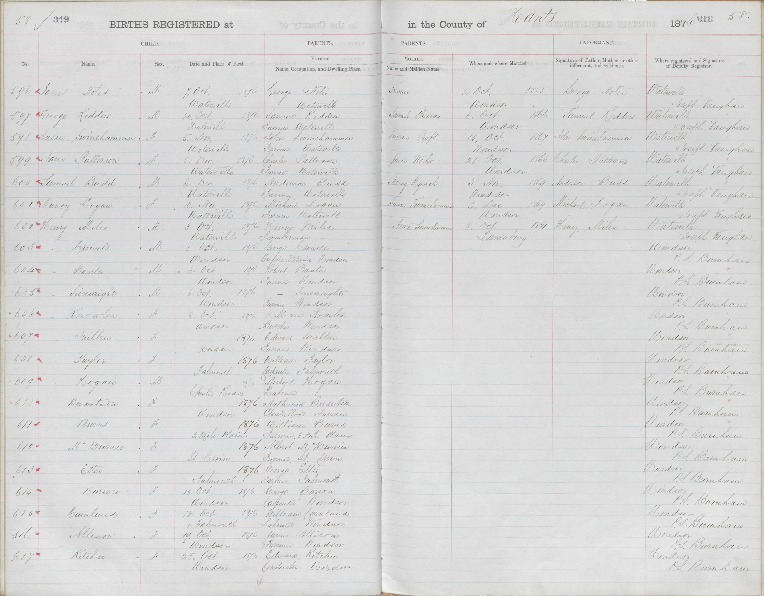 Female Birth Registration: Year: 1876 book: 1813 page: 58 number: 617