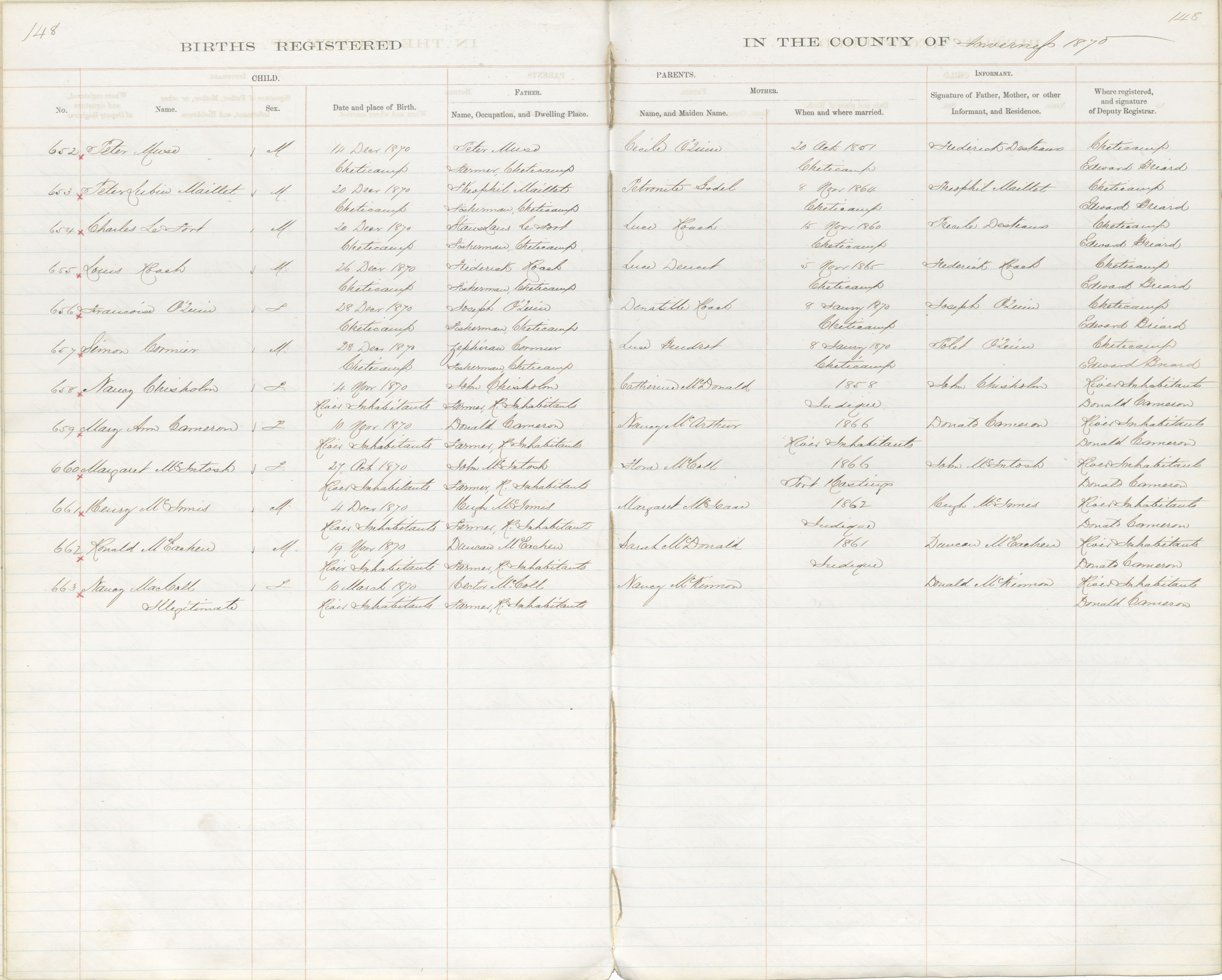 Birth Registration: Year: 1870 book: 1814 page: 148 number: 652