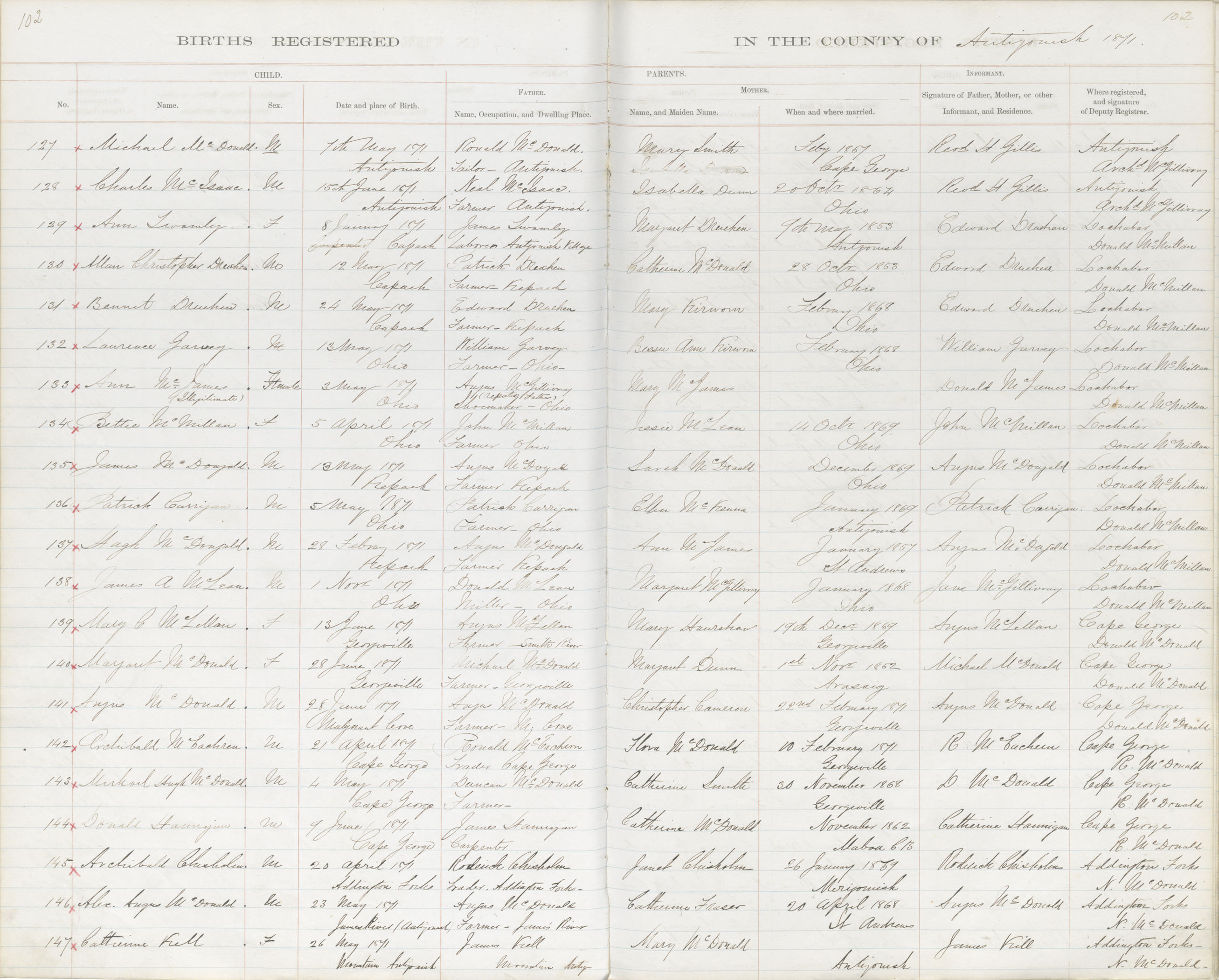 Birth Registration: Year: 1871 book: 1802 page: 102 number: 146