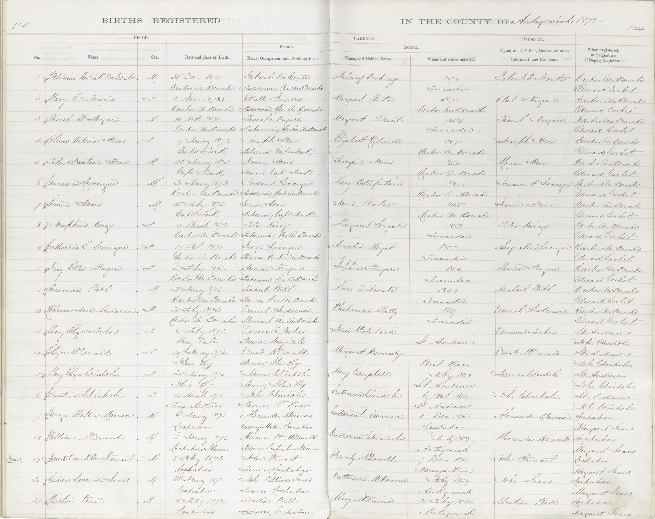 Birth Registration: Year: 1872 book: 1802 page: 114 number: 21