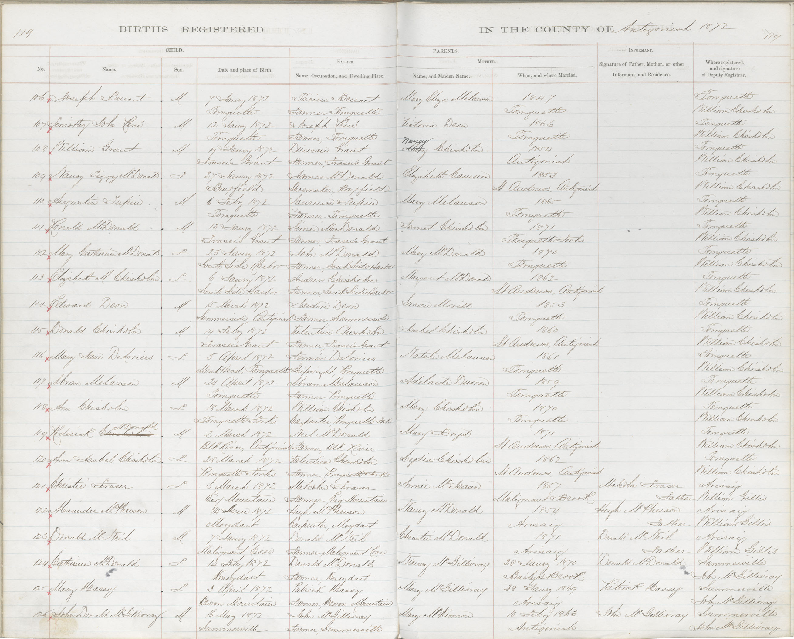 Birth Registration: Year: 1872 book: 1802 page: 119 number: 106