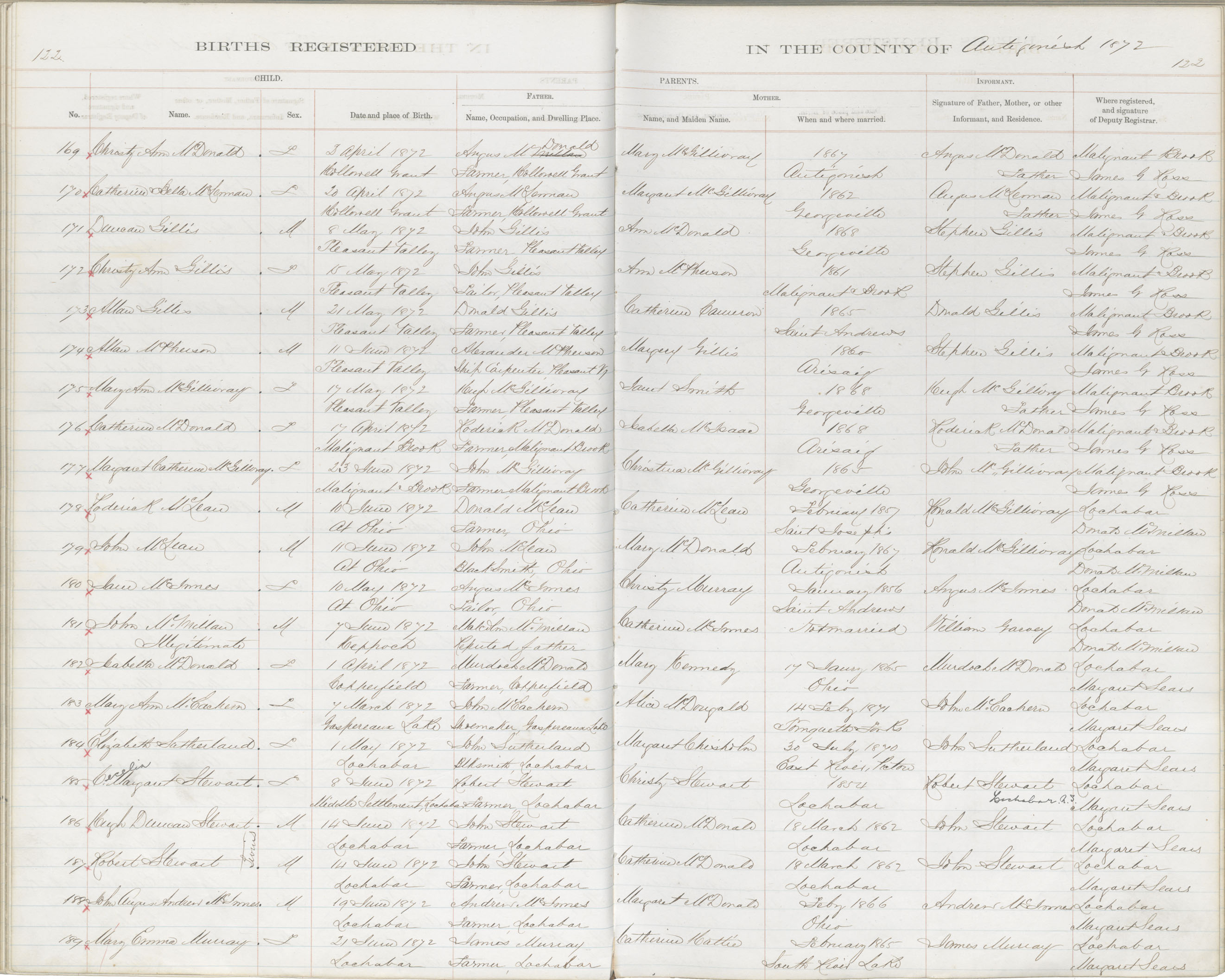 Birth Registration: Year: 1872 book: 1802 page: 122 number: 169