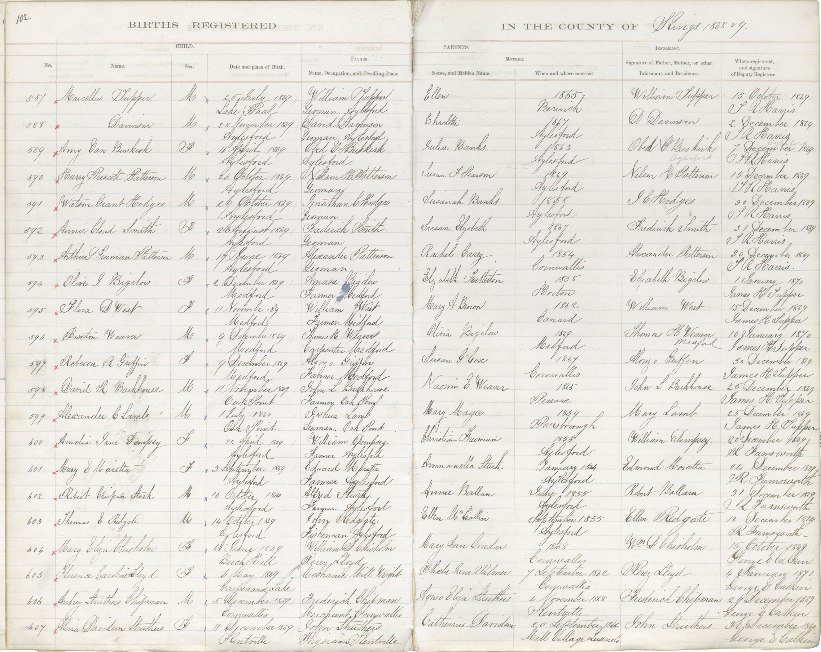 Birth Registration: Year: 1869 book: 1816 page: 102 number: 607
