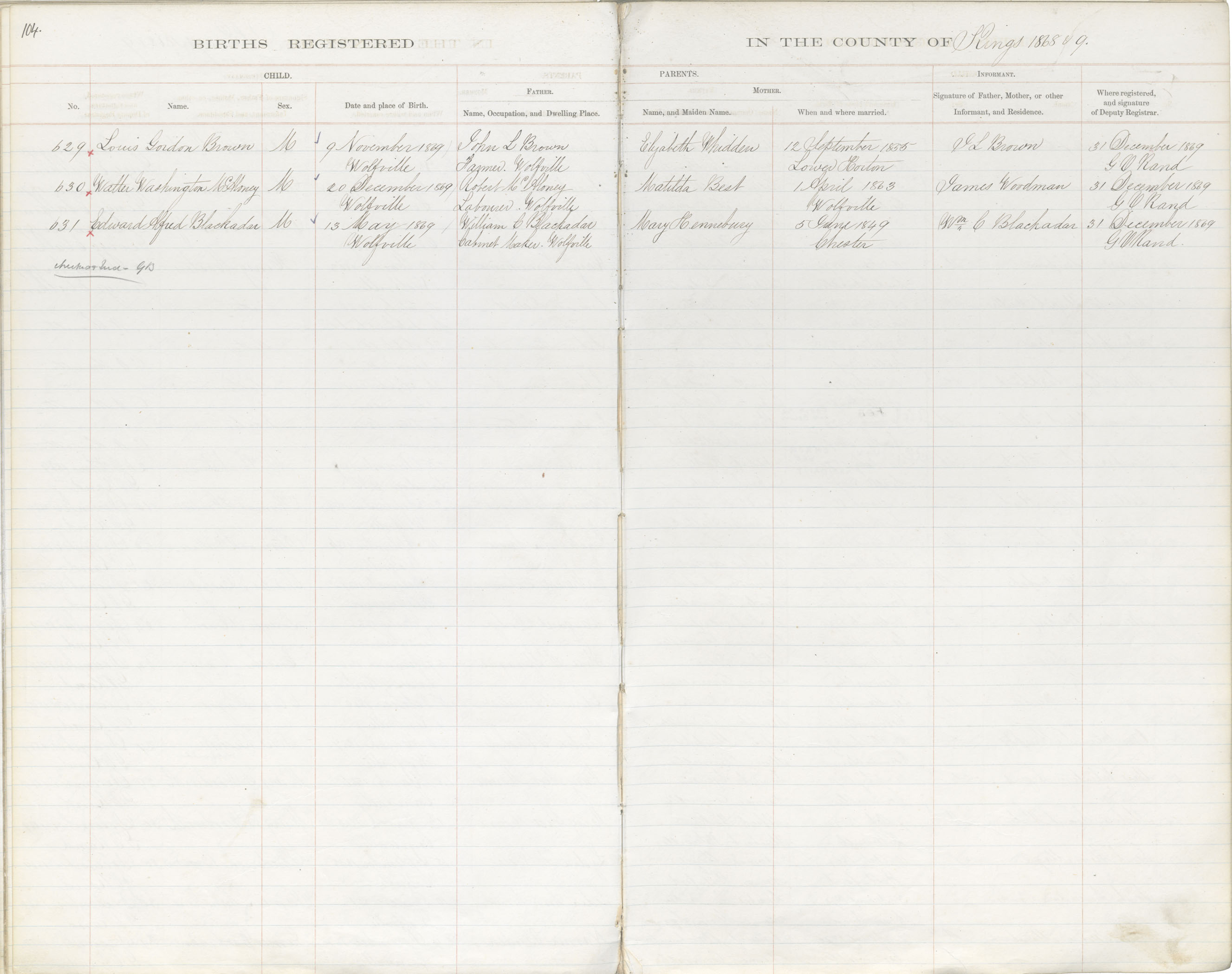 Birth Registration: Year: 1869 book: 1816 page: 104 number: 631