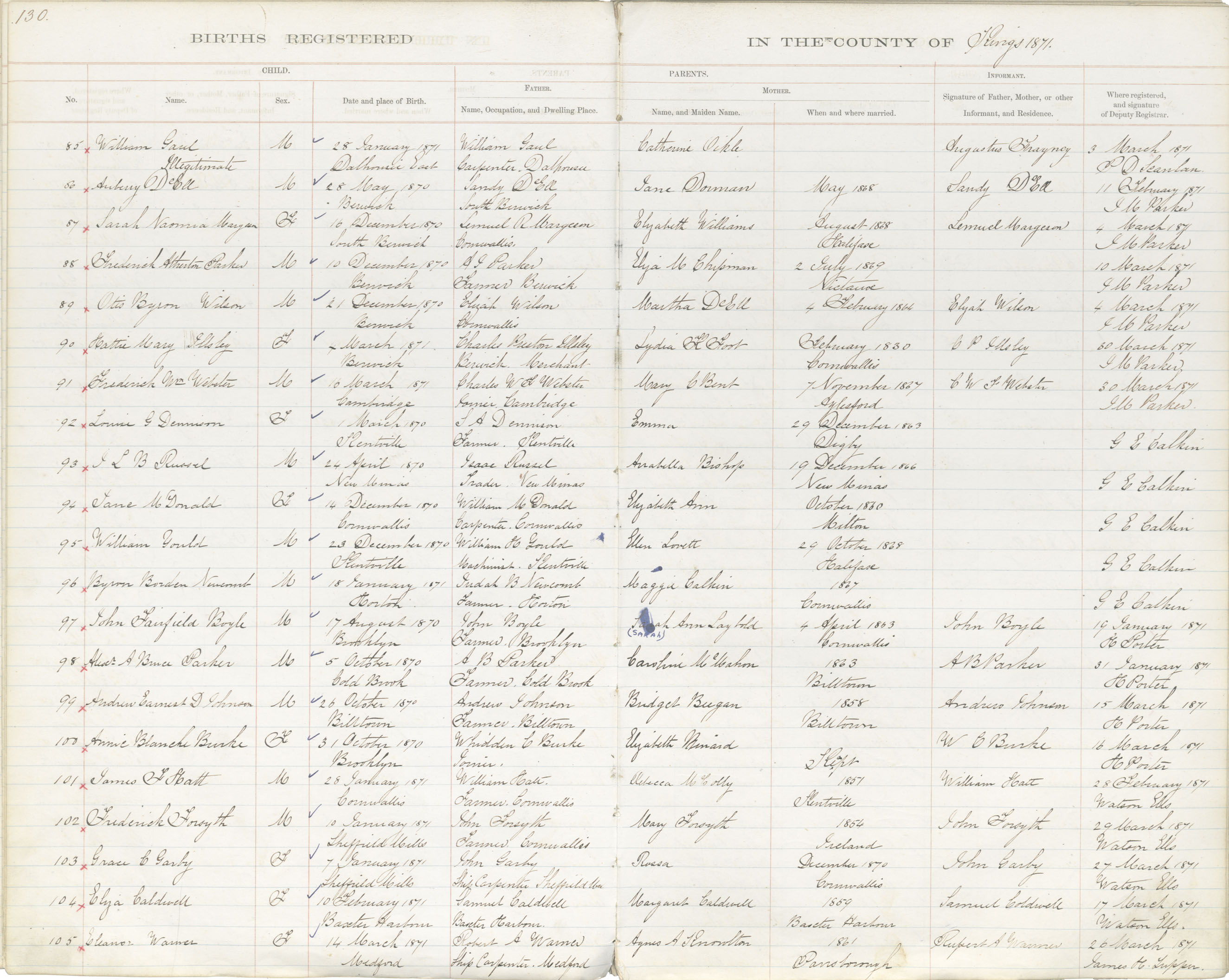Birth Registration: Year: 1871 book: 1816 page: 130 number: 85