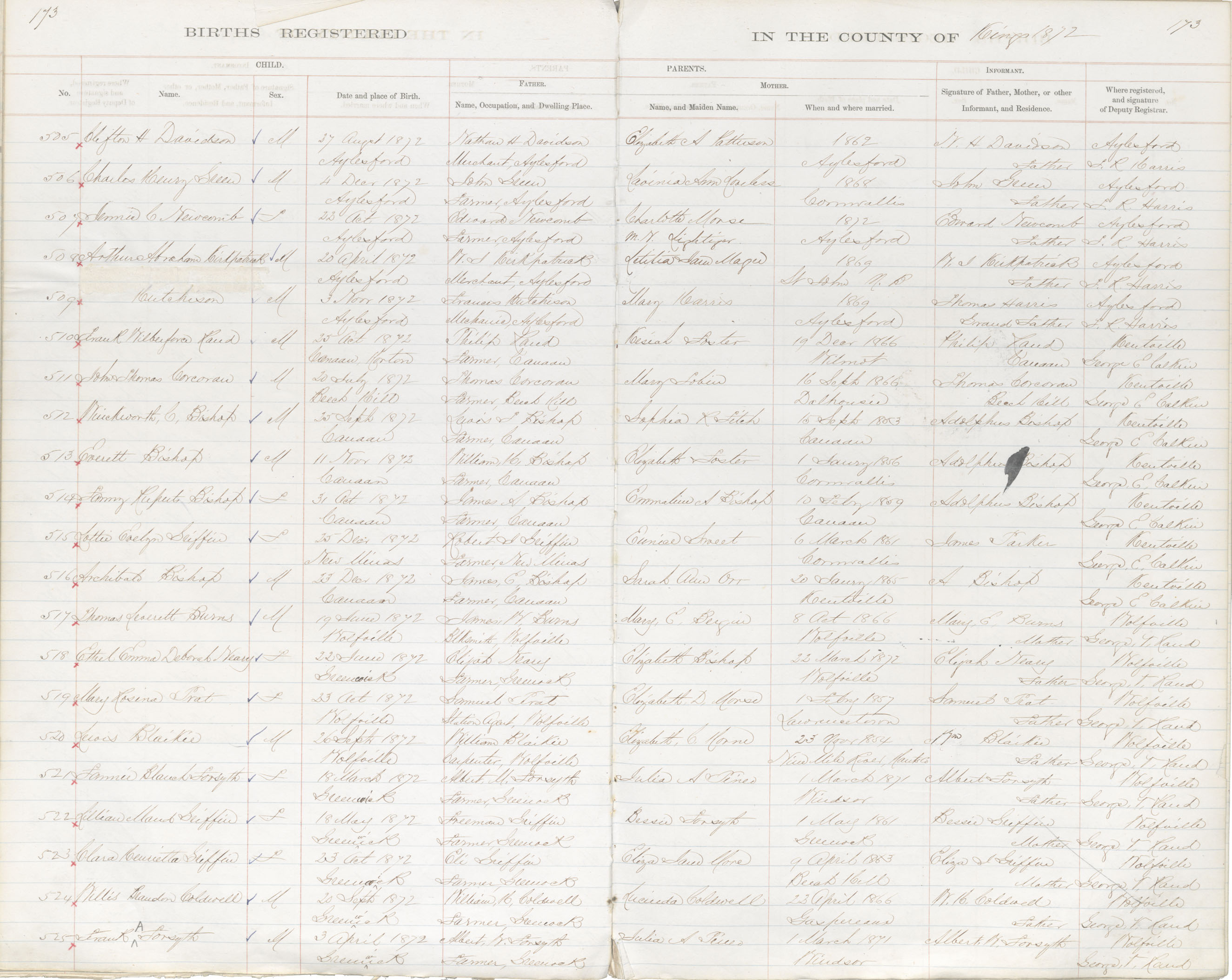 Birth Registration: Year: 1872 book: 1816 page: 173 number: 525