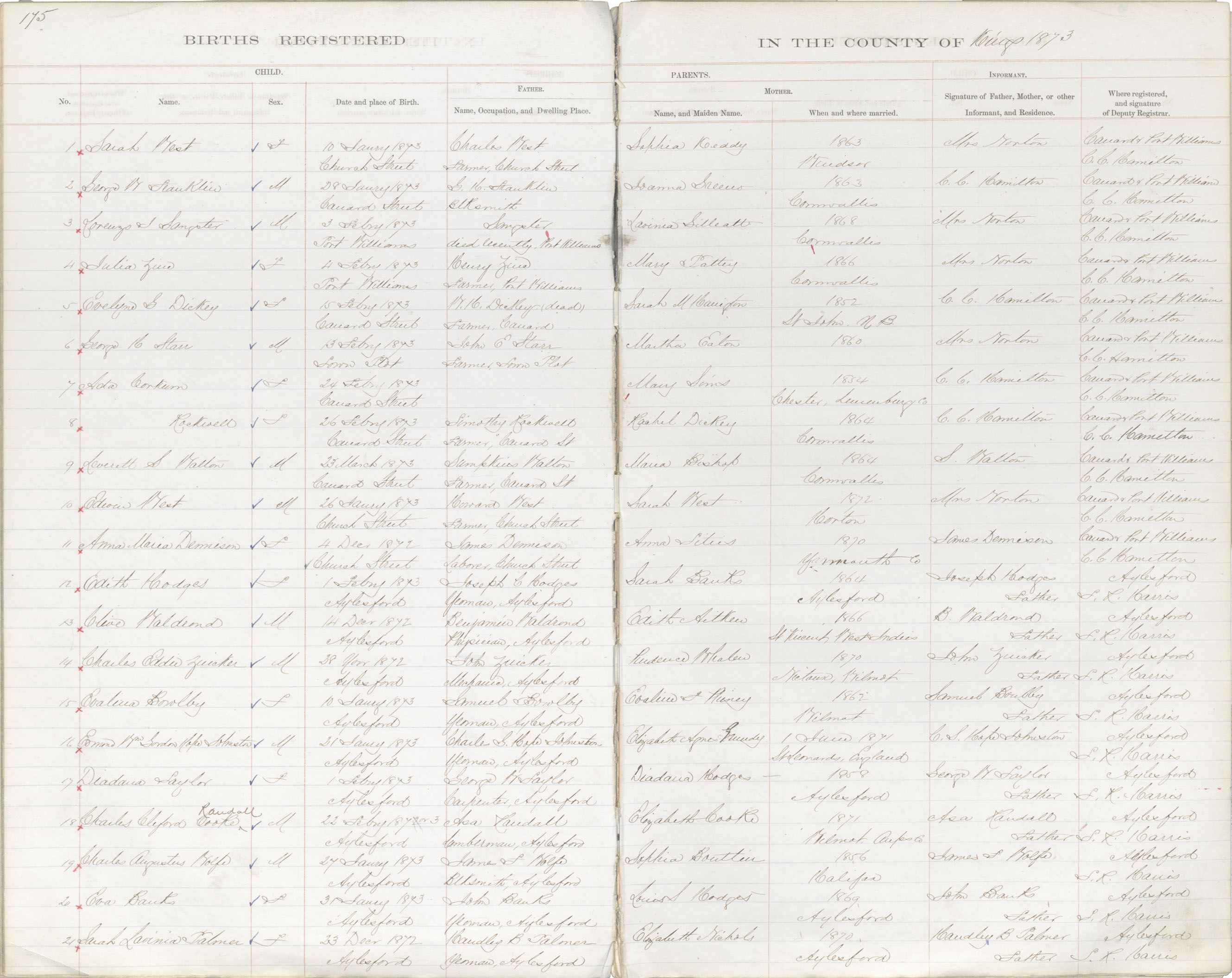 Birth Registration: Year: 1873 book: 1816 page: 175 number: 1