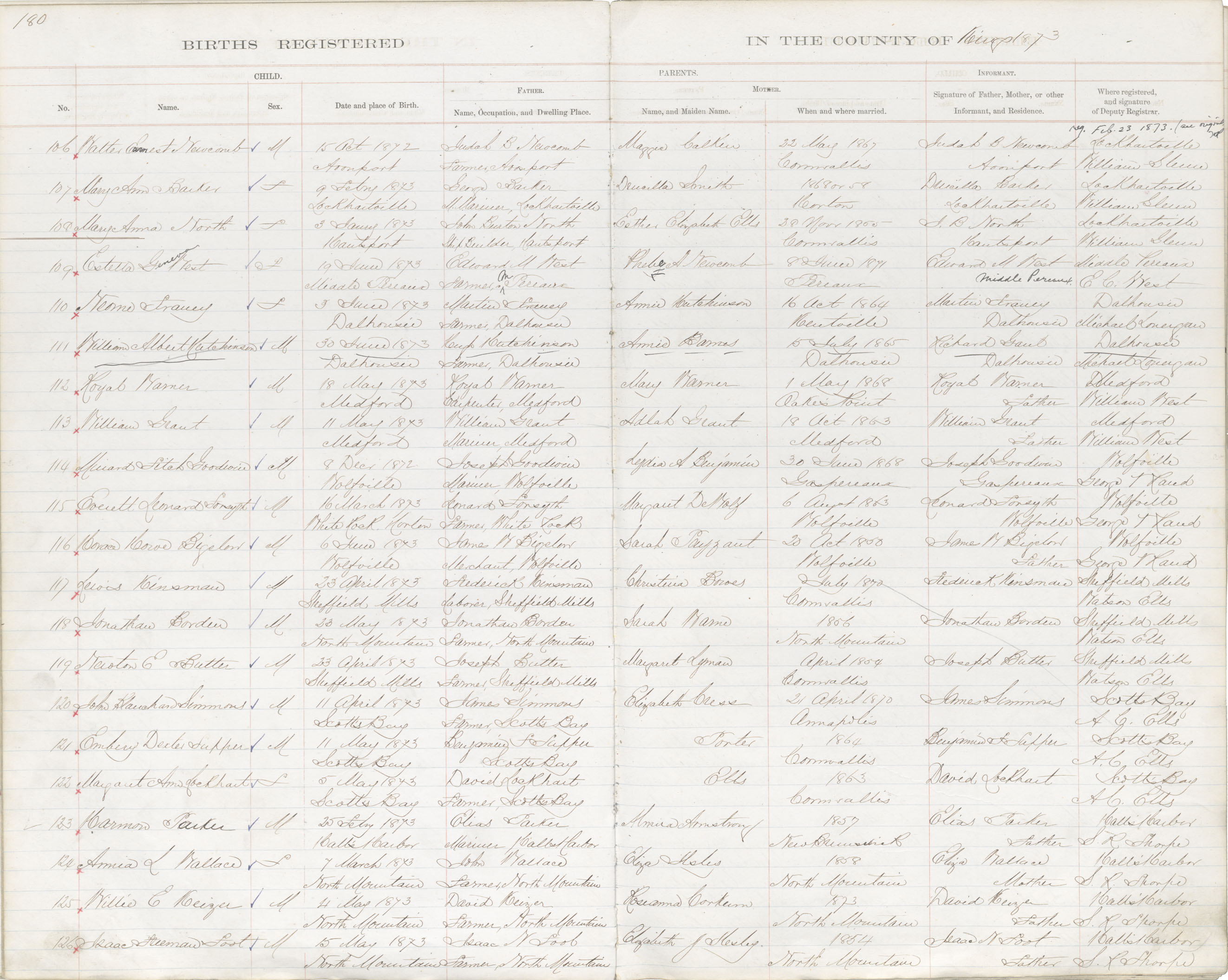 Male Birth Registration: Year: 1873 book: 1816 page: 180 number: 120