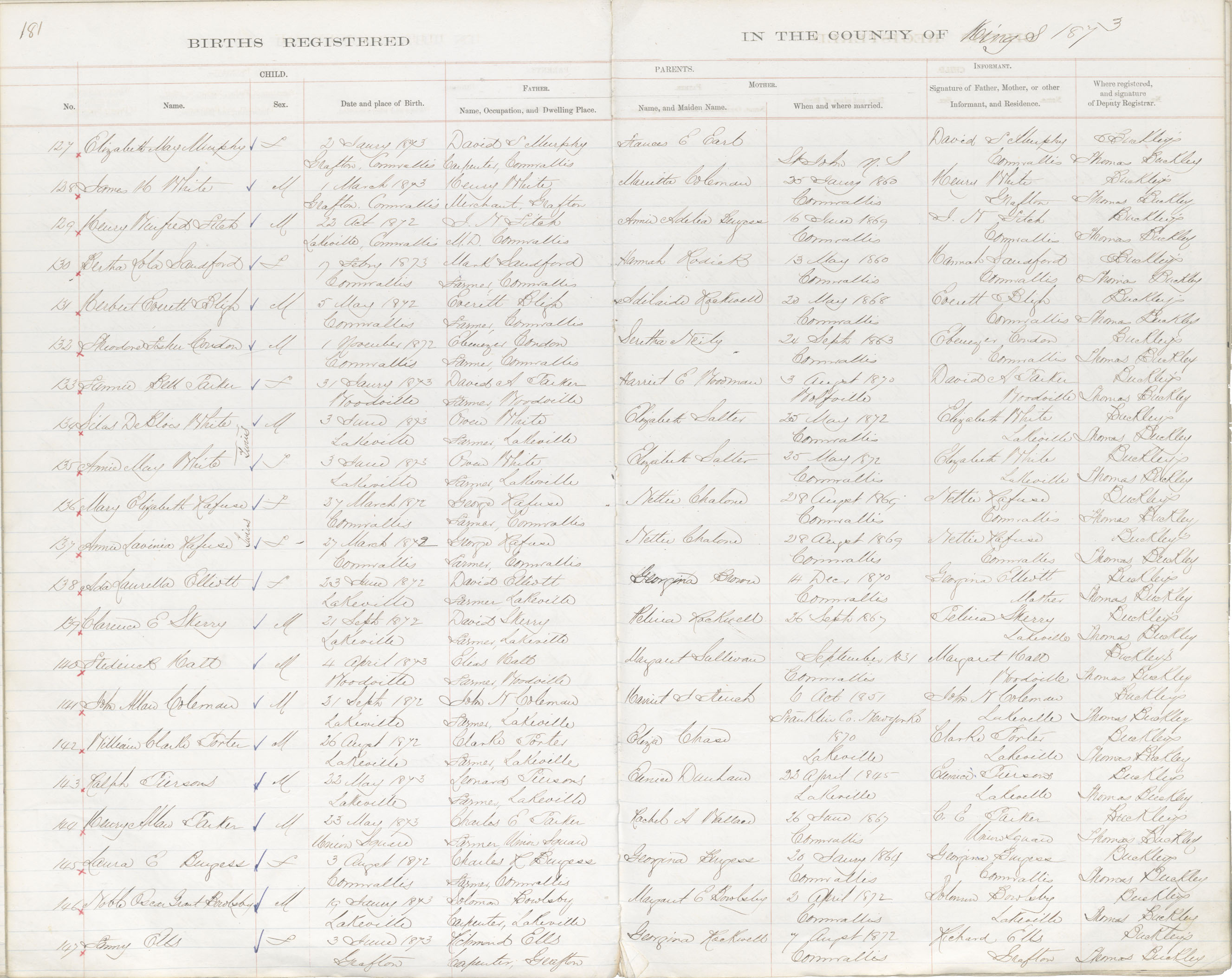 Birth Registration: Year: 1873 book: 1816 page: 181 number: 127