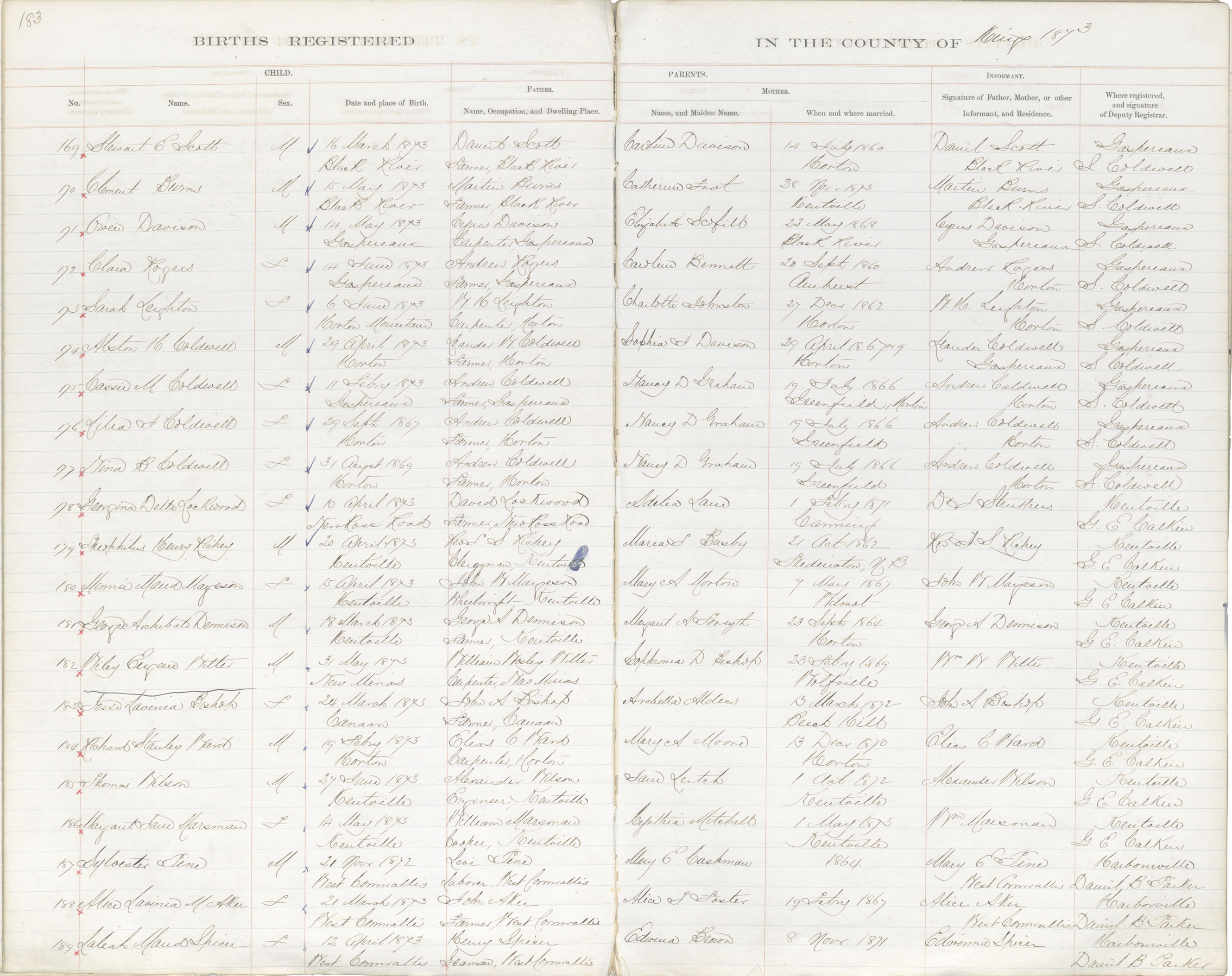 Male Birth Registration: Year: 1873 book: 1816 page: 183 number: 169