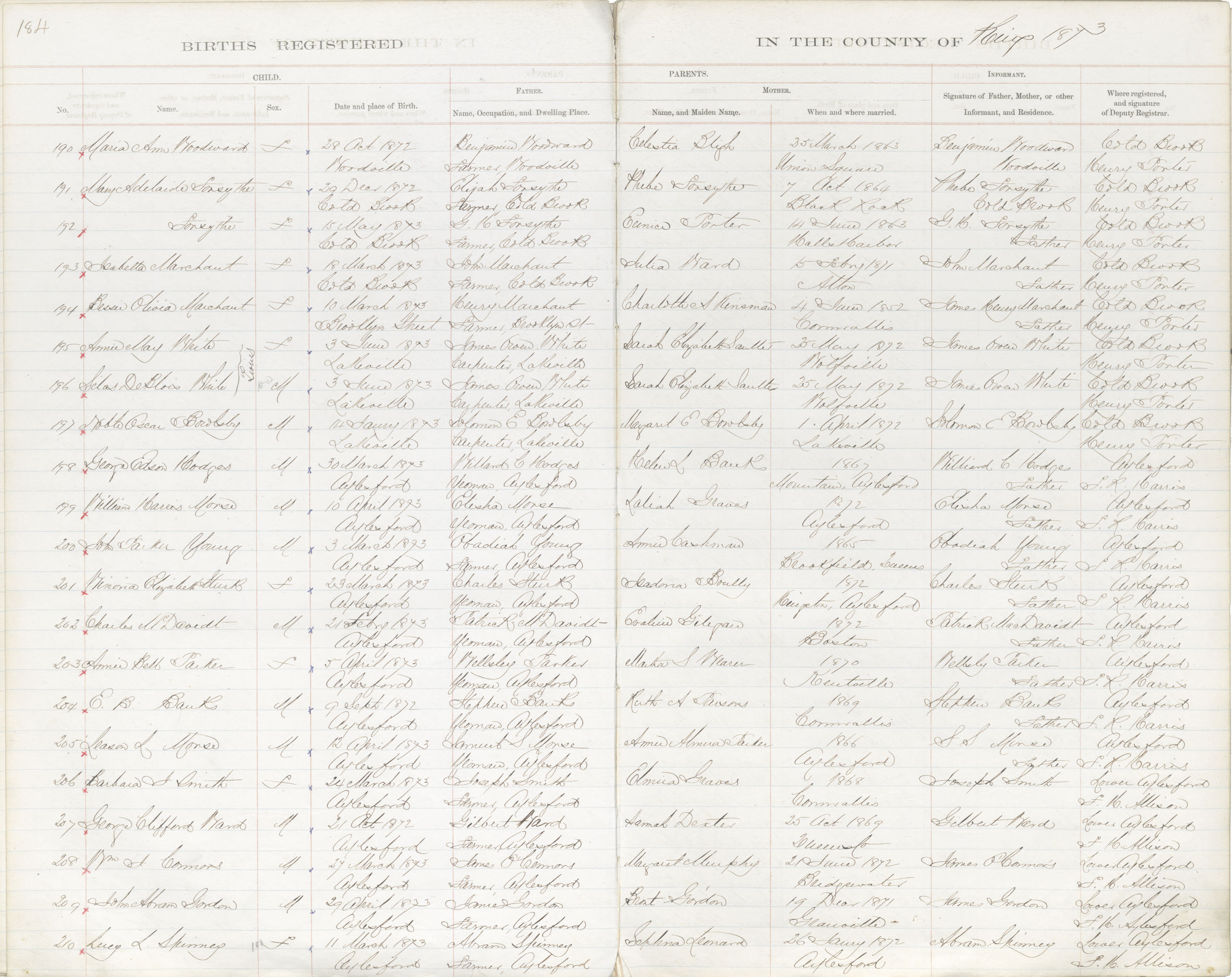 Birth Registration: Year: 1873 book: 1816 page: 184 number: 190