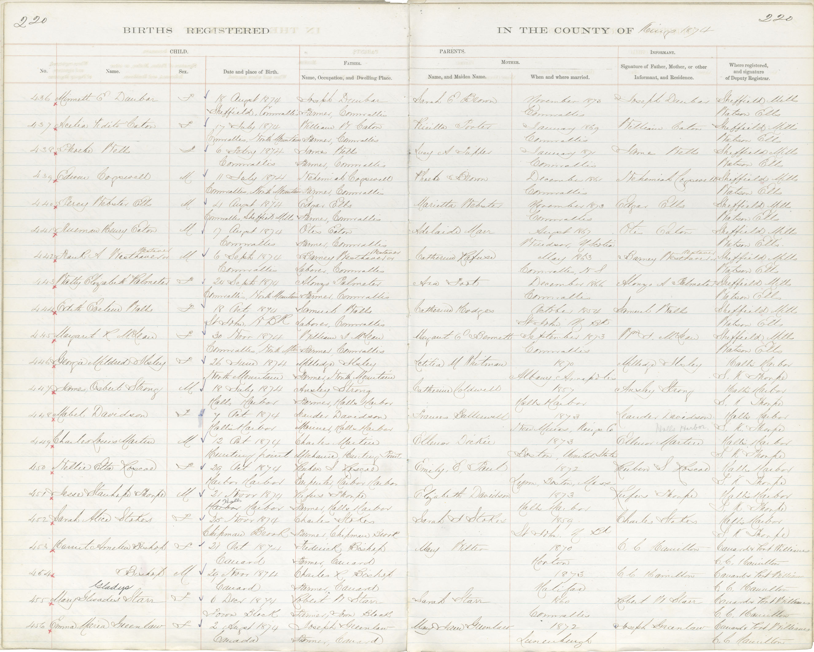Female Birth Registration: Year: 1874 book: 1816 page: 220 number: 456