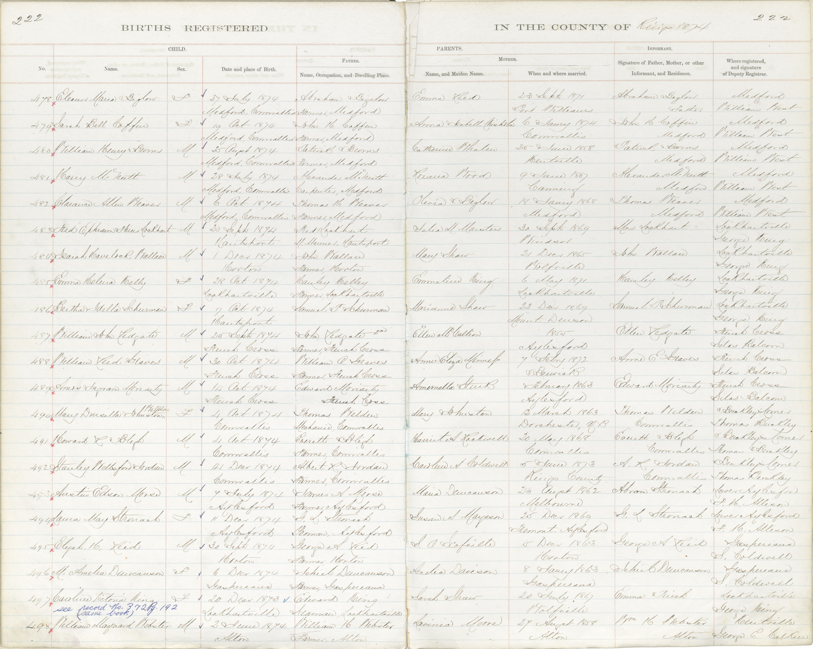 Birth Registration: Year: 1874 book: 1816 page: 222 number: 498
