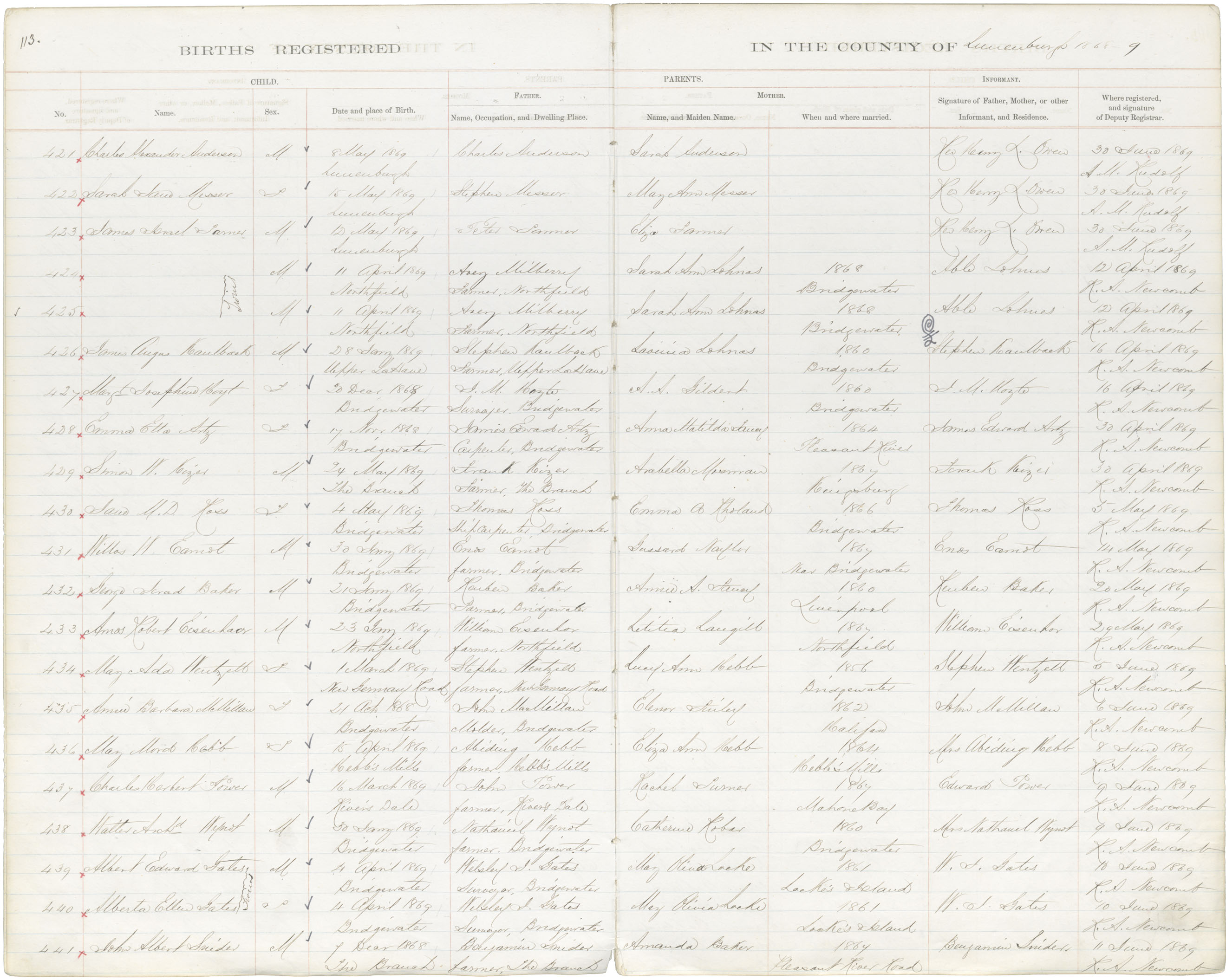 Birth Registration: Year: 1869 book: 1817 page: 113 number: 421