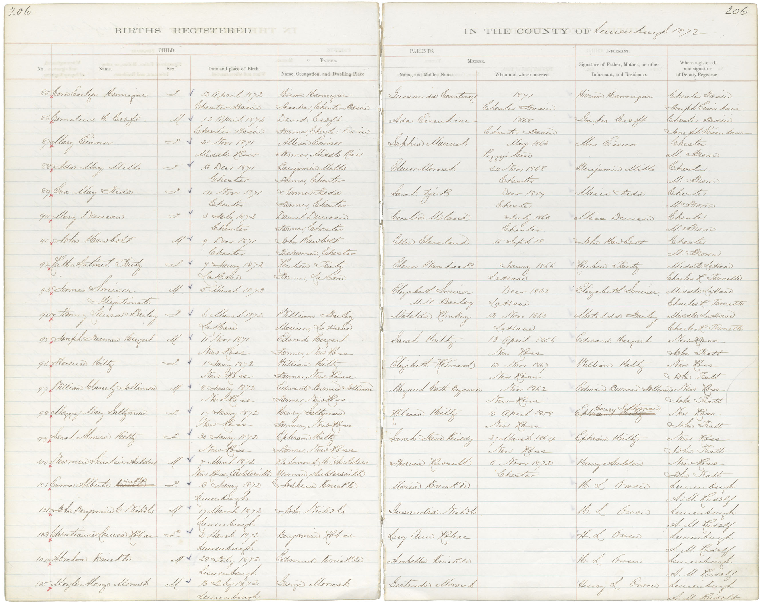 Female Birth Registration: Year: 1872 book: 1817 page: 206 number: 85