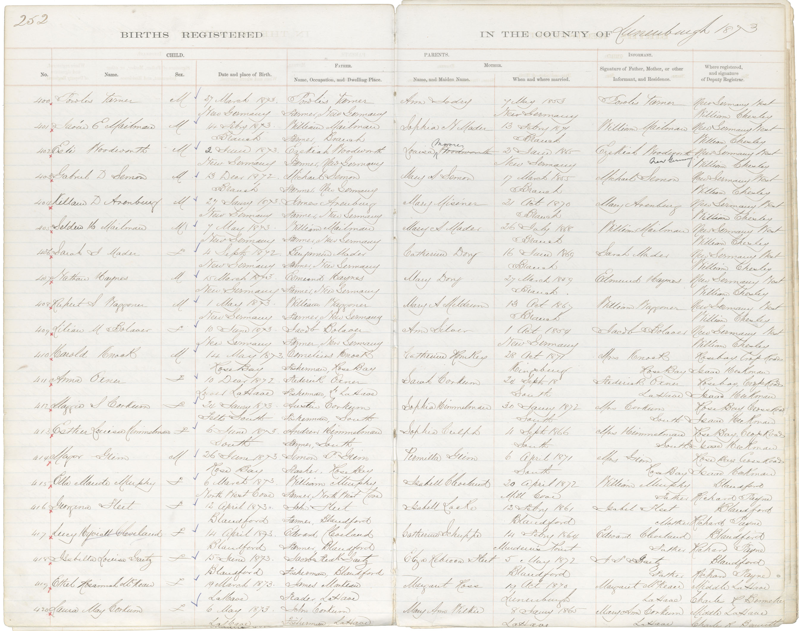 Birth Registration: Year: 1873 book: 1817 page: 252 number: 420