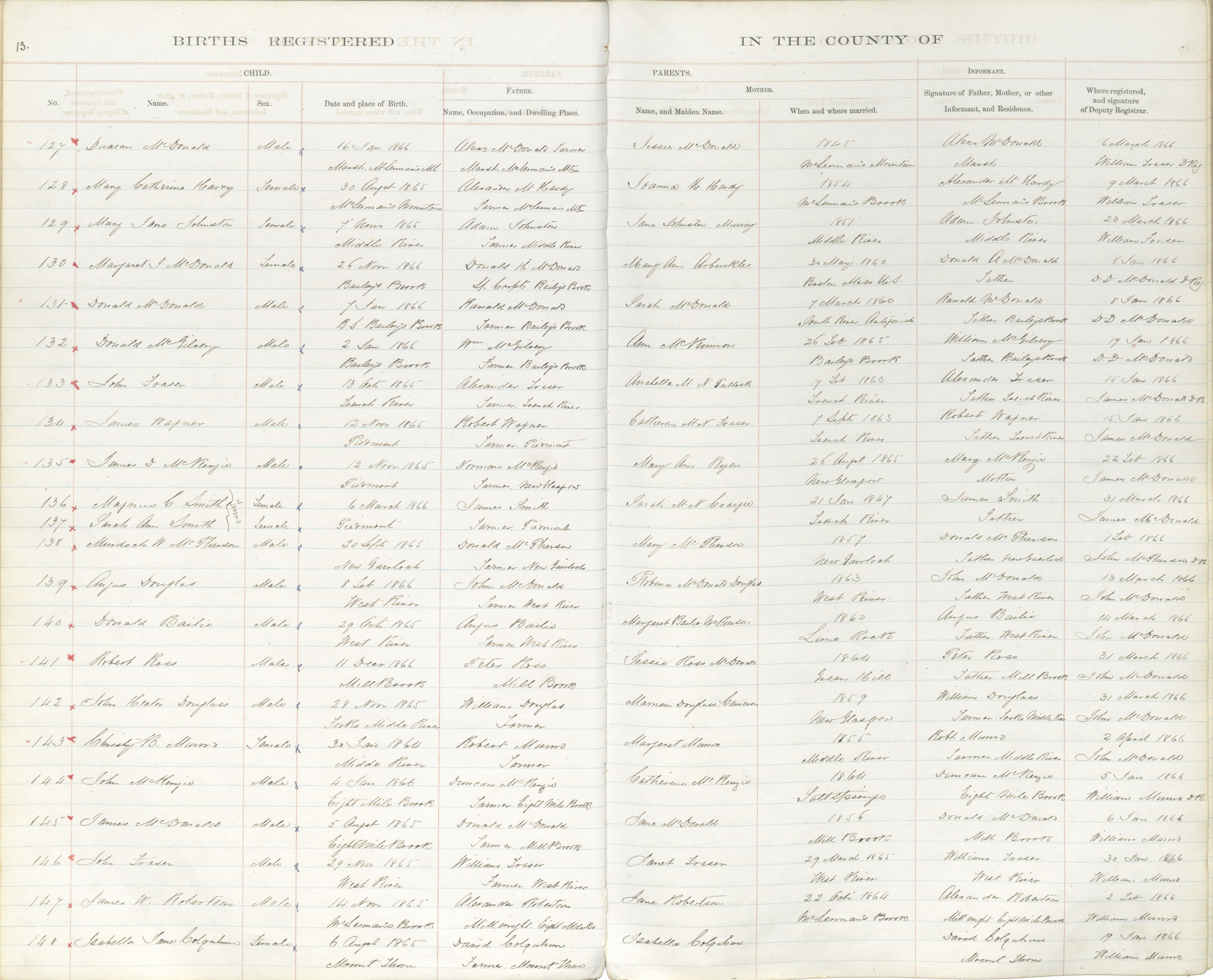 Birth Registration: Year: 1866 book: 1818 page: 13 number: 127