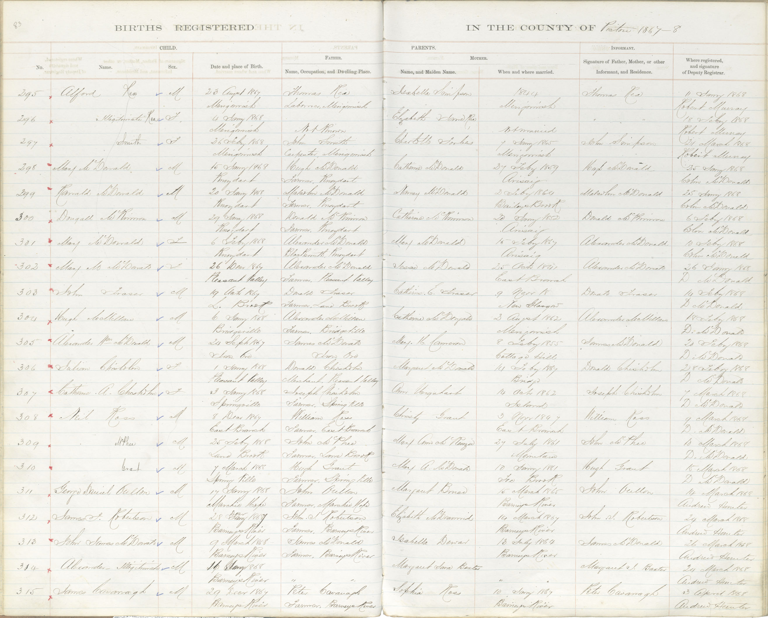 Birth Registration: Year: 1867 book: 1818 page: 83 number: 315