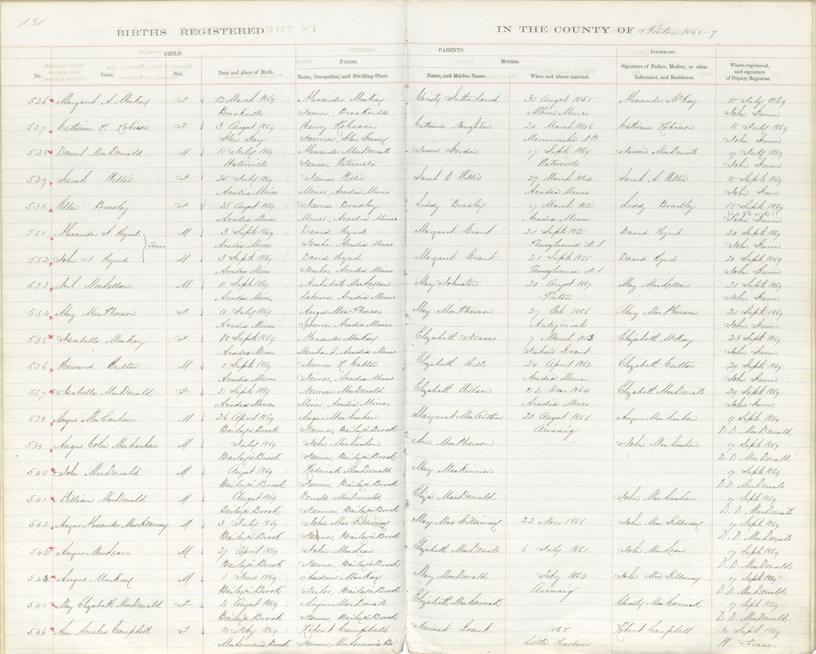Birth Registration: Year: 1869 book: 1818 page: 131 number: 526