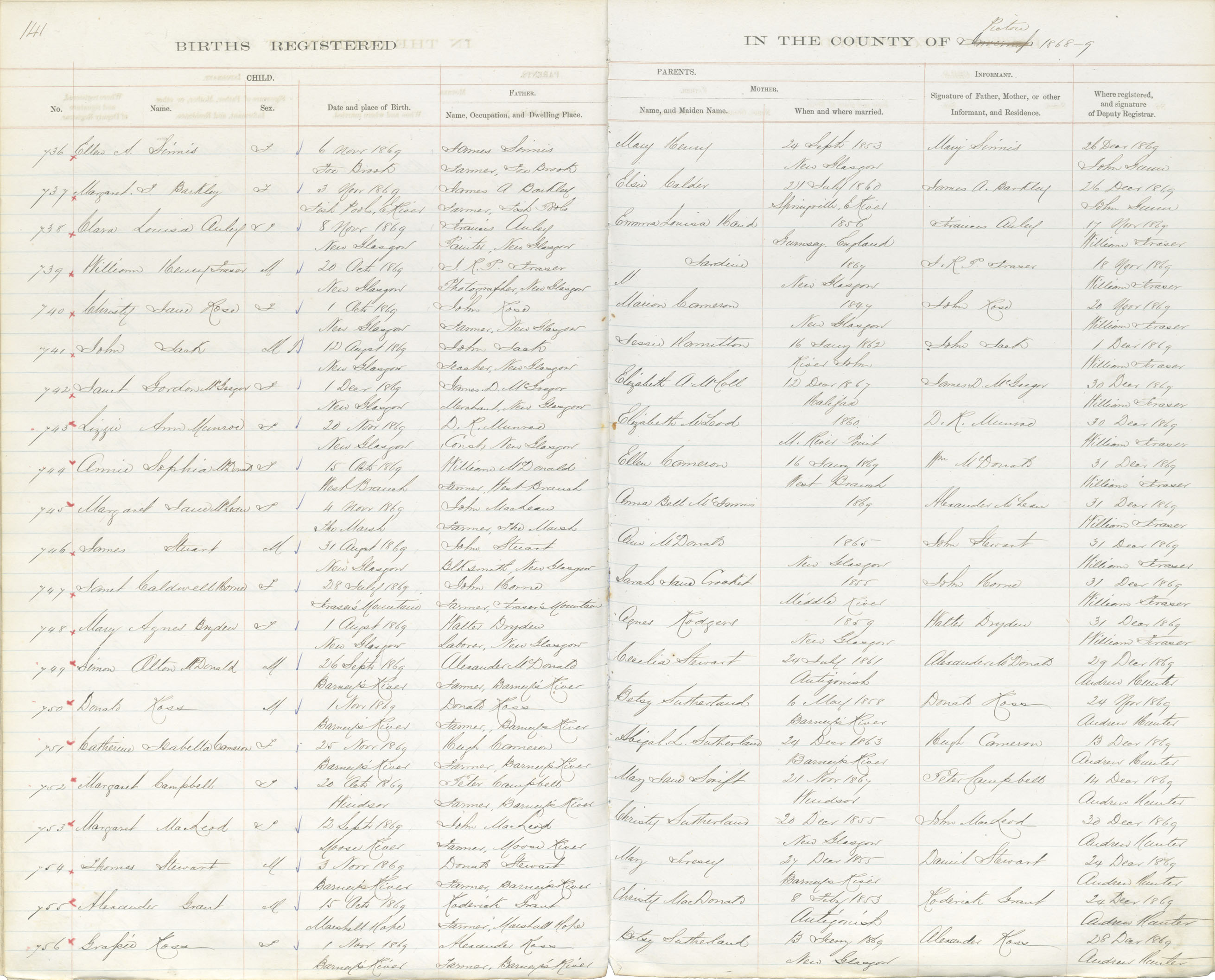 Birth Registration: Year: 1869 book: 1818 page: 141 number: 736