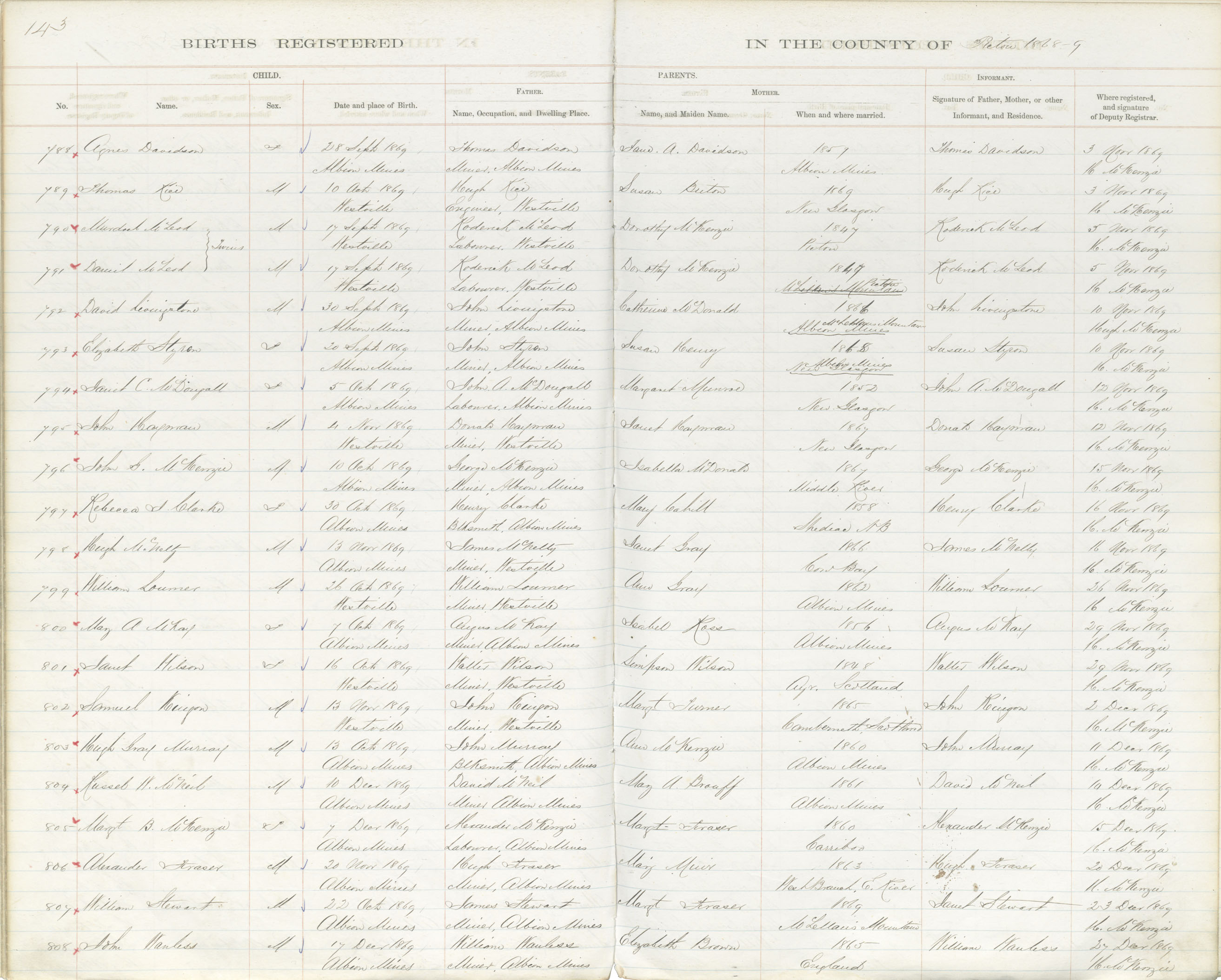 Birth Registration: Year: 1869 book: 1818 page: 143 number: 808